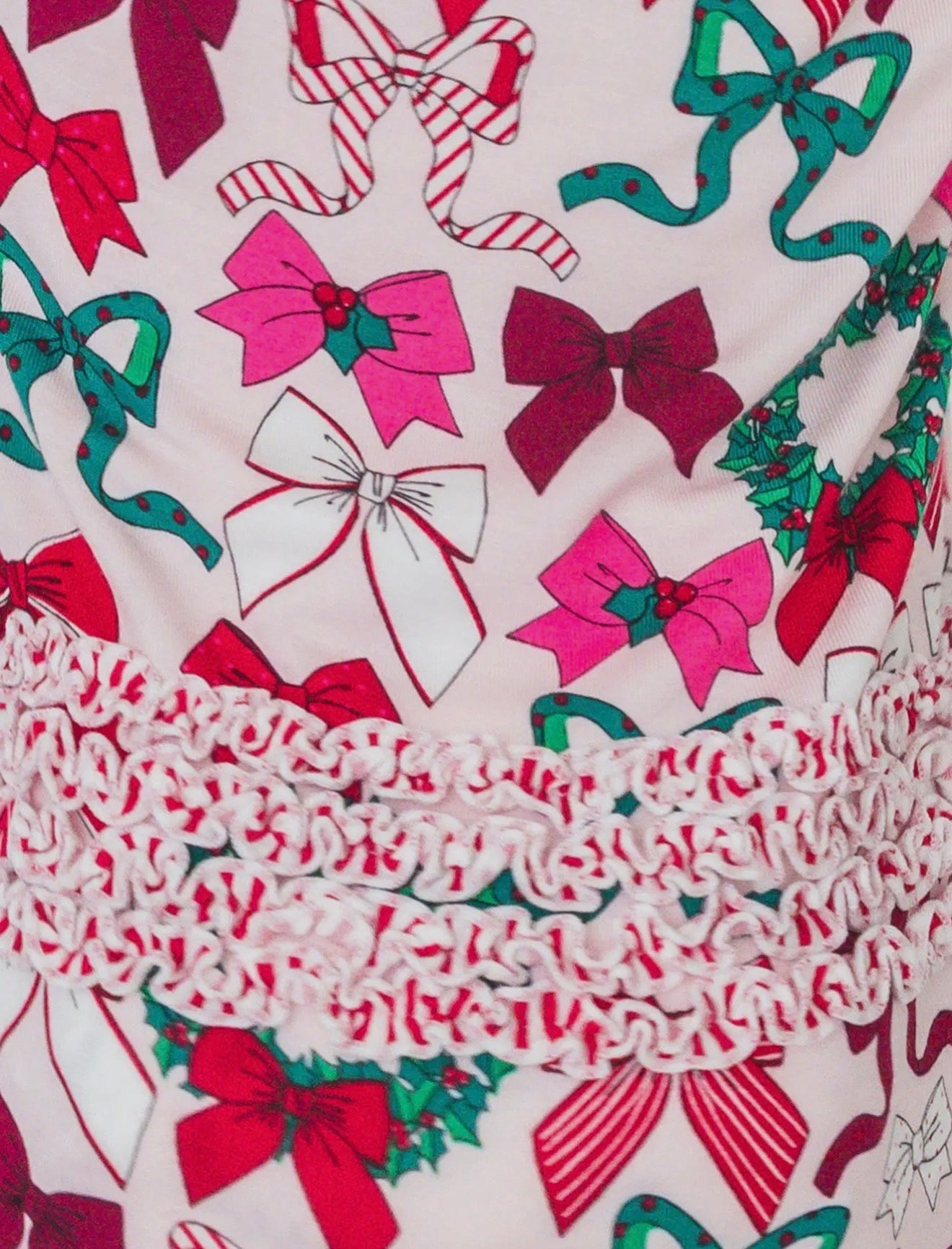 Sweet dreams meet festive cheer in our Bows & Wreaths Convertible Ruffle Pajama, a darling Christmas print filled with playful bows, candy canes, and wreaths in shades of holly green, merry red, and winter white. Made from ultra-soft stretch fabric, this cozy set keeps little ones comfy all night long while the charming peppermint-striped ruffle trim adds that extra holiday sparkle. The top features a soft elastic ruffle detail across the back, while the matching pants have snug cuffs for a secure fit. Perfect for Christmas morning photos, family matching moments, and every magical bedtime leading up to the big day!
