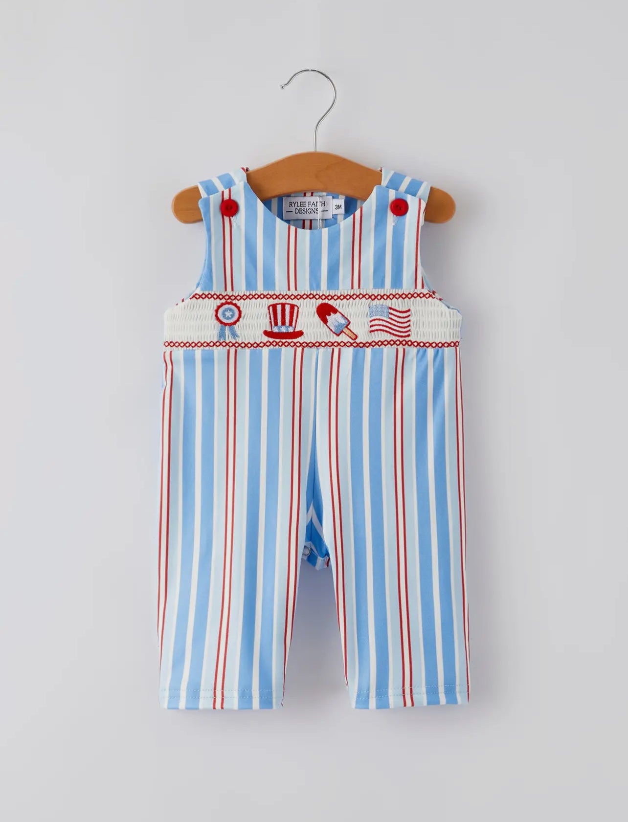 Our Americana Boys Romper is the perfect addition to your little one's wardrobe. With its patriotic striped design and smocked detailing, it's great for all American holidays. Made with soft materials and featuring buttons on the legs and top, it's both adorable and practical for easy changes.