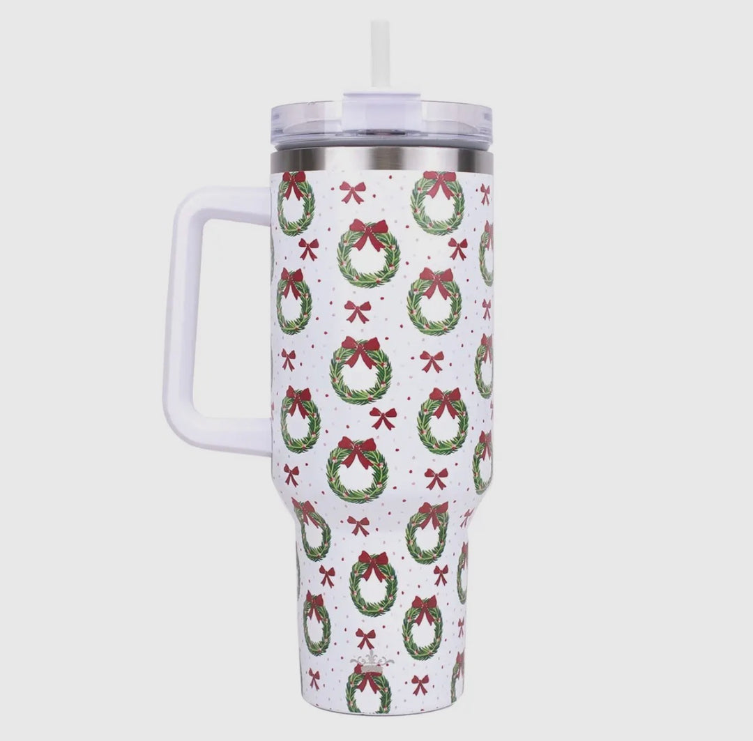Holiday Wreath Stainless Steel Tumbler with Handle & Straw