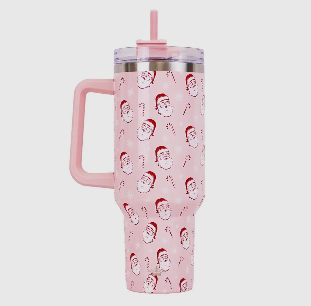 Pink Santa Stainless Steel Tumbler with Handle & Straw
