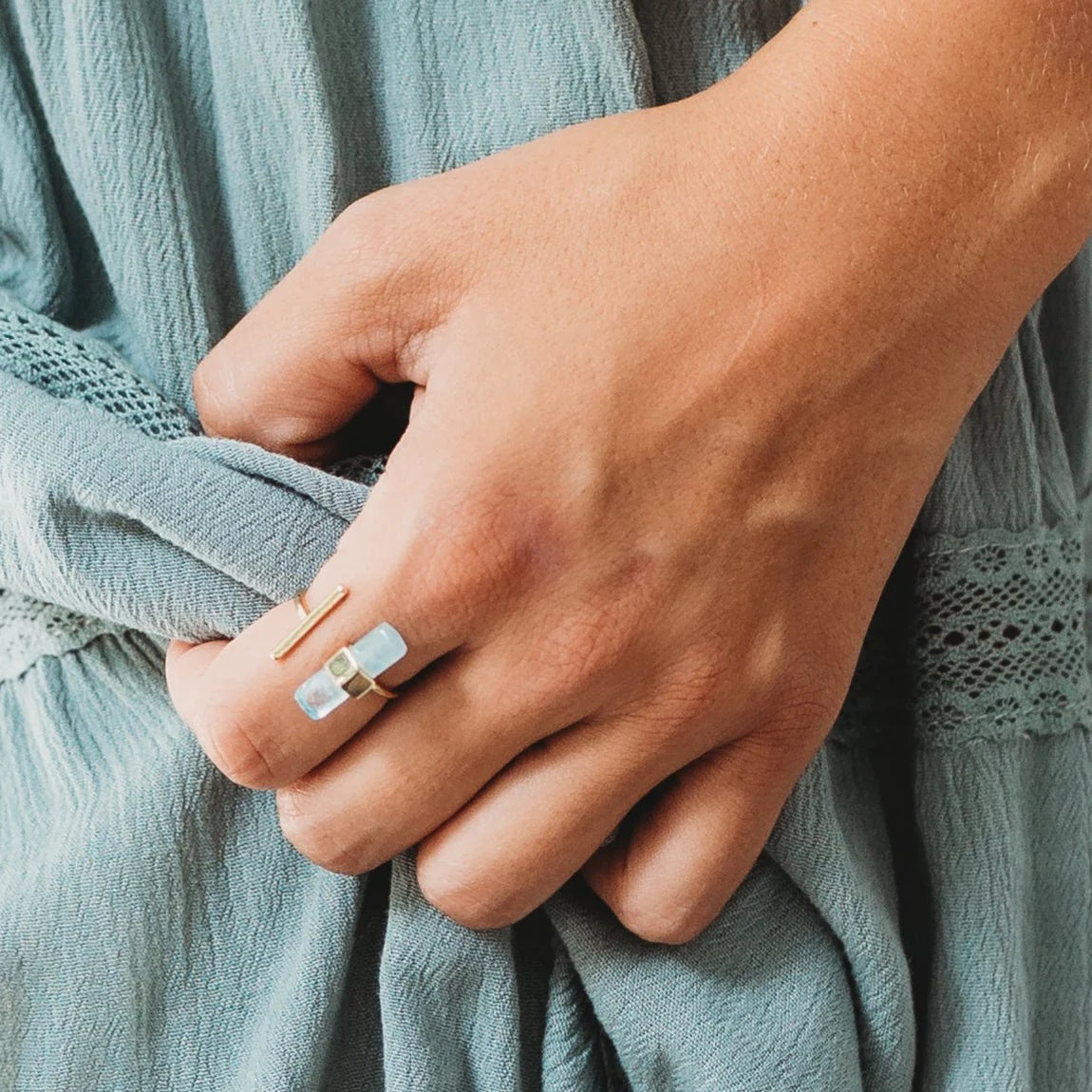 • Amazonite + Gemstone Ring: A delicate gold band set with raw-cut amazonite stones and a central faceted gem. Each stone is naturally unique, bringing subtle color and individuality to your look.