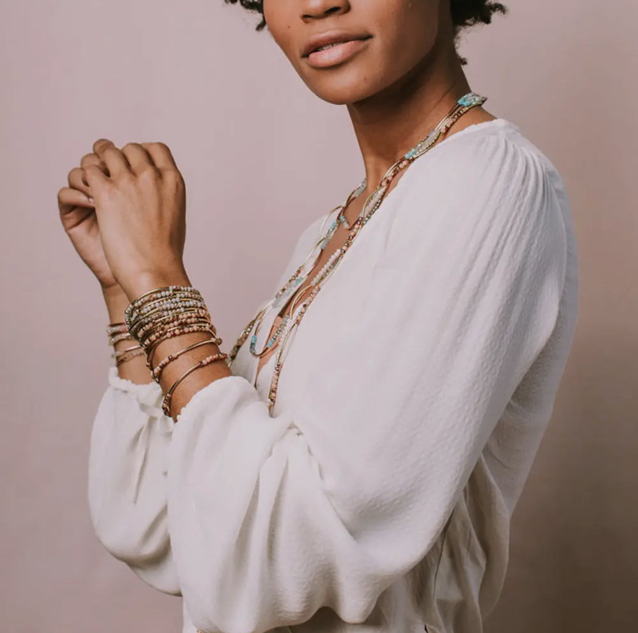 The Scout Wrap Bracelet/Necklace is the perfect accessory for any stylish woman. This versatile piece can be worn as a bracelet or necklace, making it a fun and functional addition to any wardrobe. With its stylish design, it is sure to elevate any outfit. Indulge in this must-have women's accessory today! Great gift option.