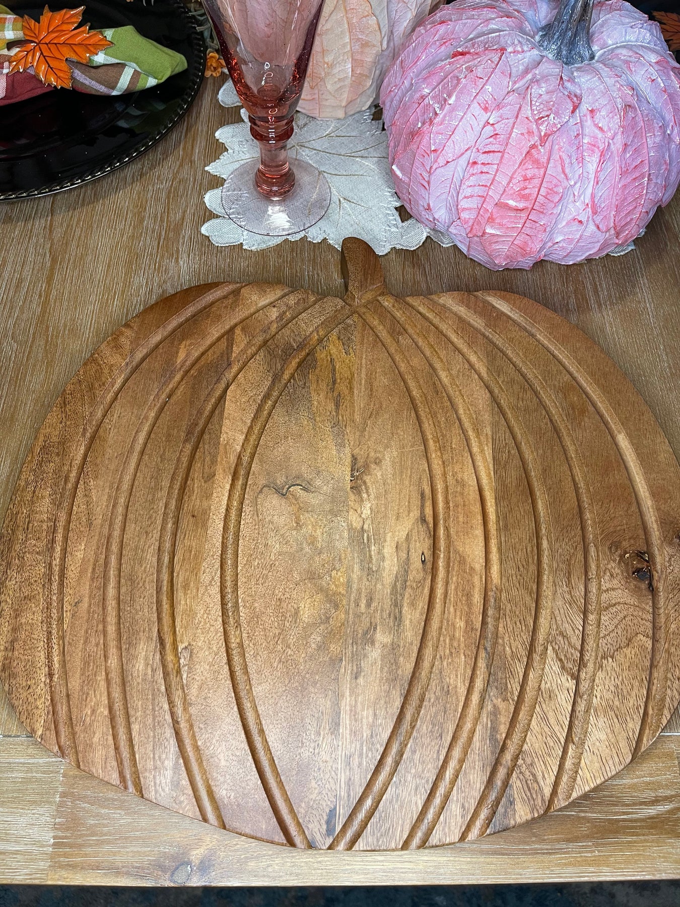 Hand-carved out of mango wood, and absolutely gorgeous! This pumpkin tray will be perfect for all of your gatherings this fall. Stack it high with fruits or veggies and serve.
