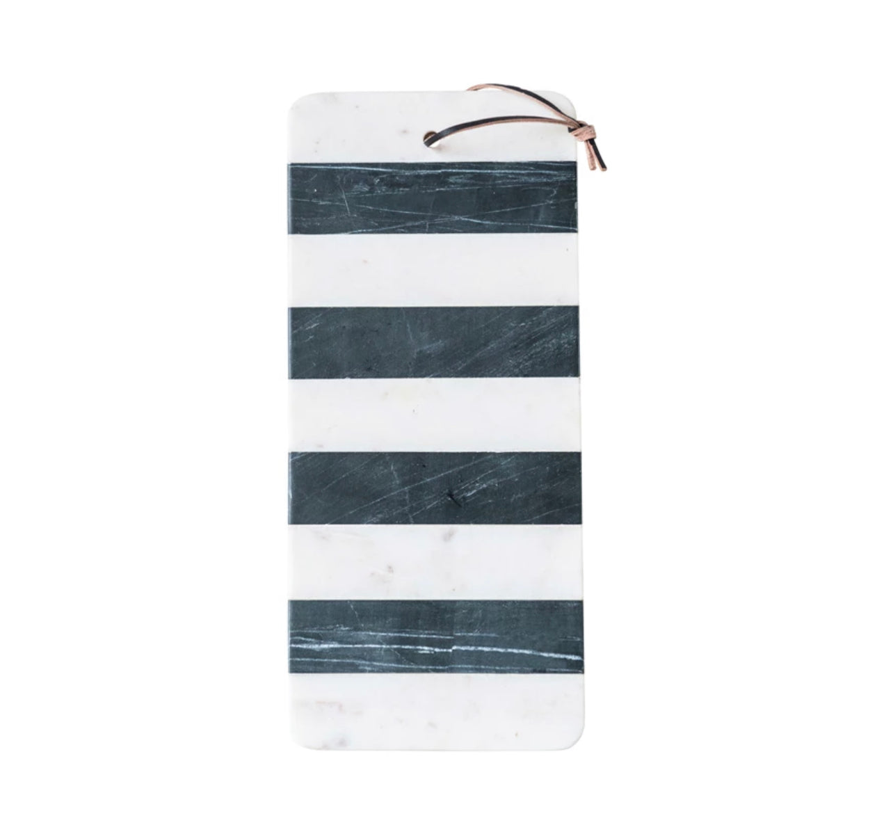 Decorate your kitchen with this blue and white striped cutting board & then use it when you need it. The function and beauty go hand-in-hand! No need to shove it in a cabinet because it is beautiful enough to leave out and the leather strap makes it easy to hang on a hook.