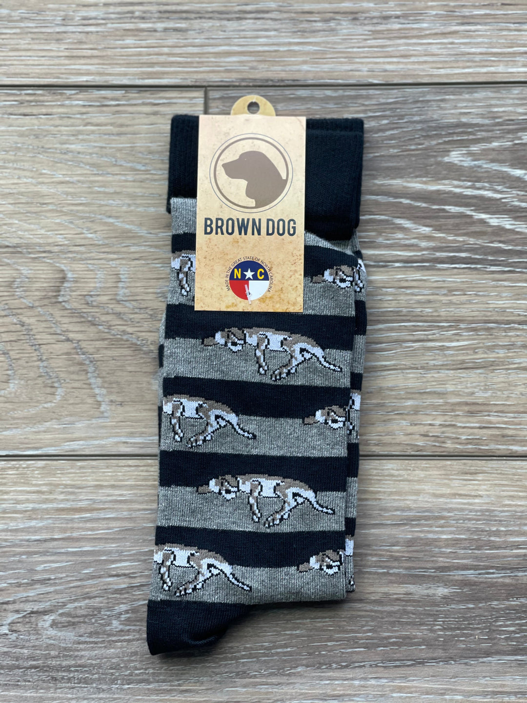 These socks are so adorable with the sleeping GSP. Makes a great gift for Pointer lovers/owners, or even just guys that love dress socks. The foot has arch support and the legs won’t slide down. Color is navy and gray. Quality of these socks is unmatched. Made by an amazing local business here in NC.