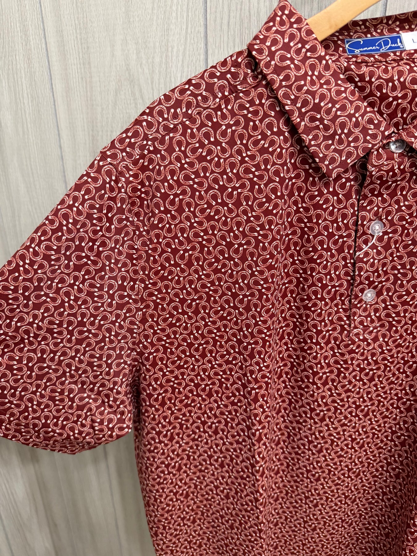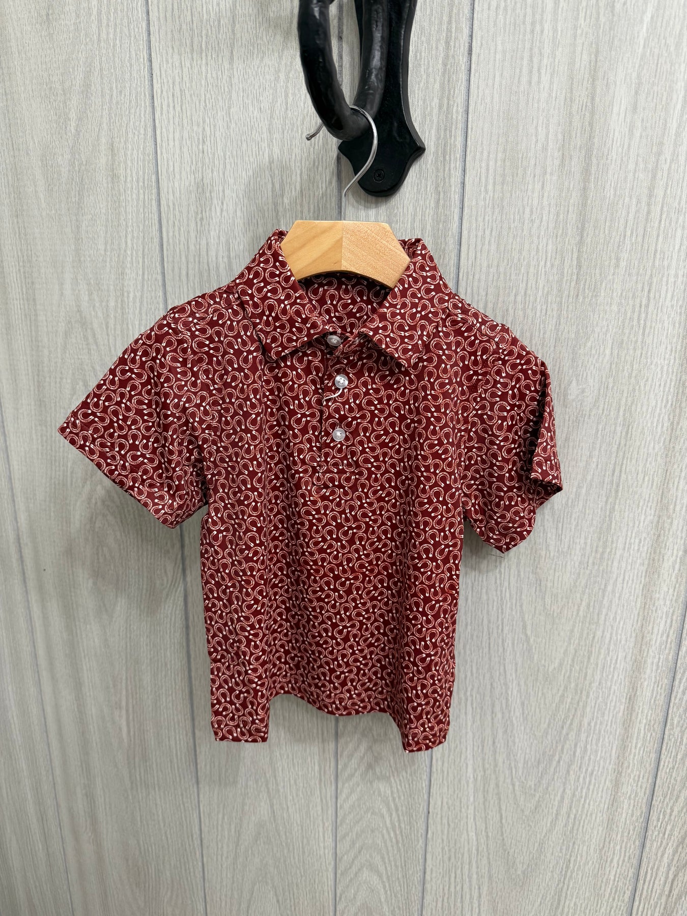 Clean, classic, and subtly western, The Station Polo is an elevated everyday staple with timeless appeal. Designed in a rich, warm rust tone, this polo features an all-over horseshoe print that nods to Western heritage while keeping the look polished and refined. The structured collar and button placket maintain a classic silhouette that transitions effortlessly from casual outings to family events.