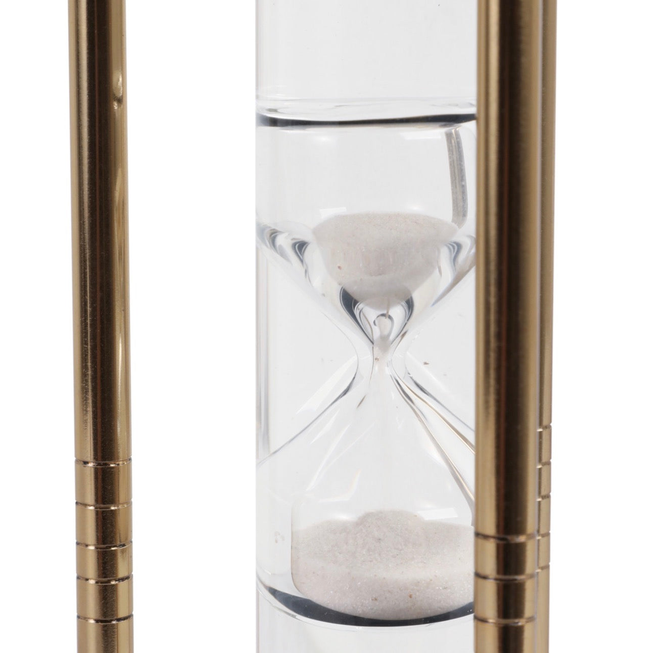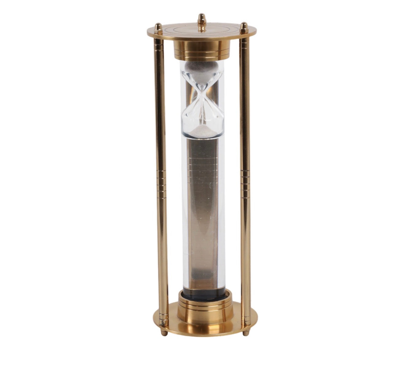 Standing 12” tall with a 4” diameter base, it’s perfectly scaled for coffee tables, consoles, bookshelves, or office styling. The vertical brass columns and circular top and base give it a refined, almost museum-like presence, while the soft white sand inside adds subtle texture and visual calm.