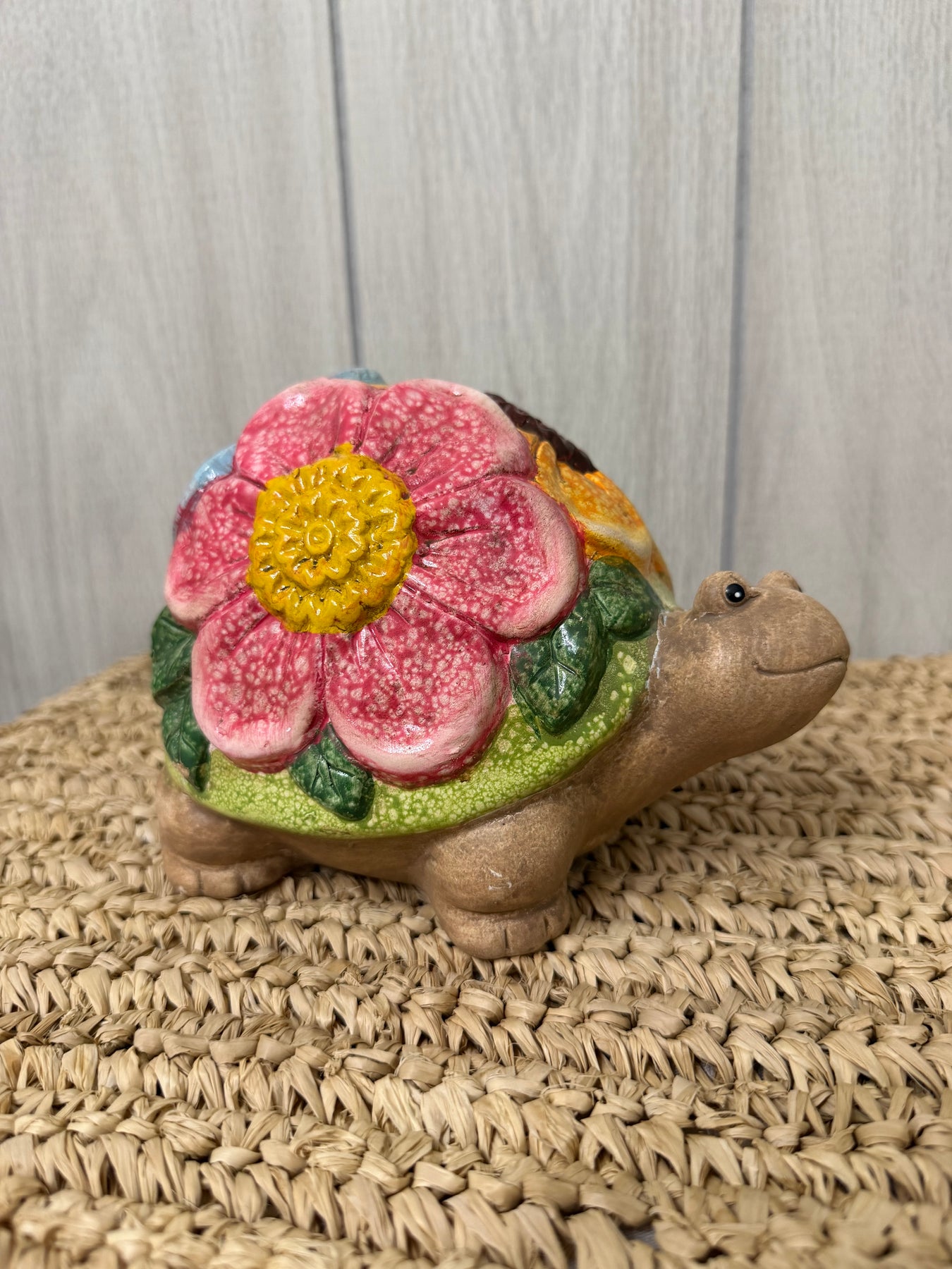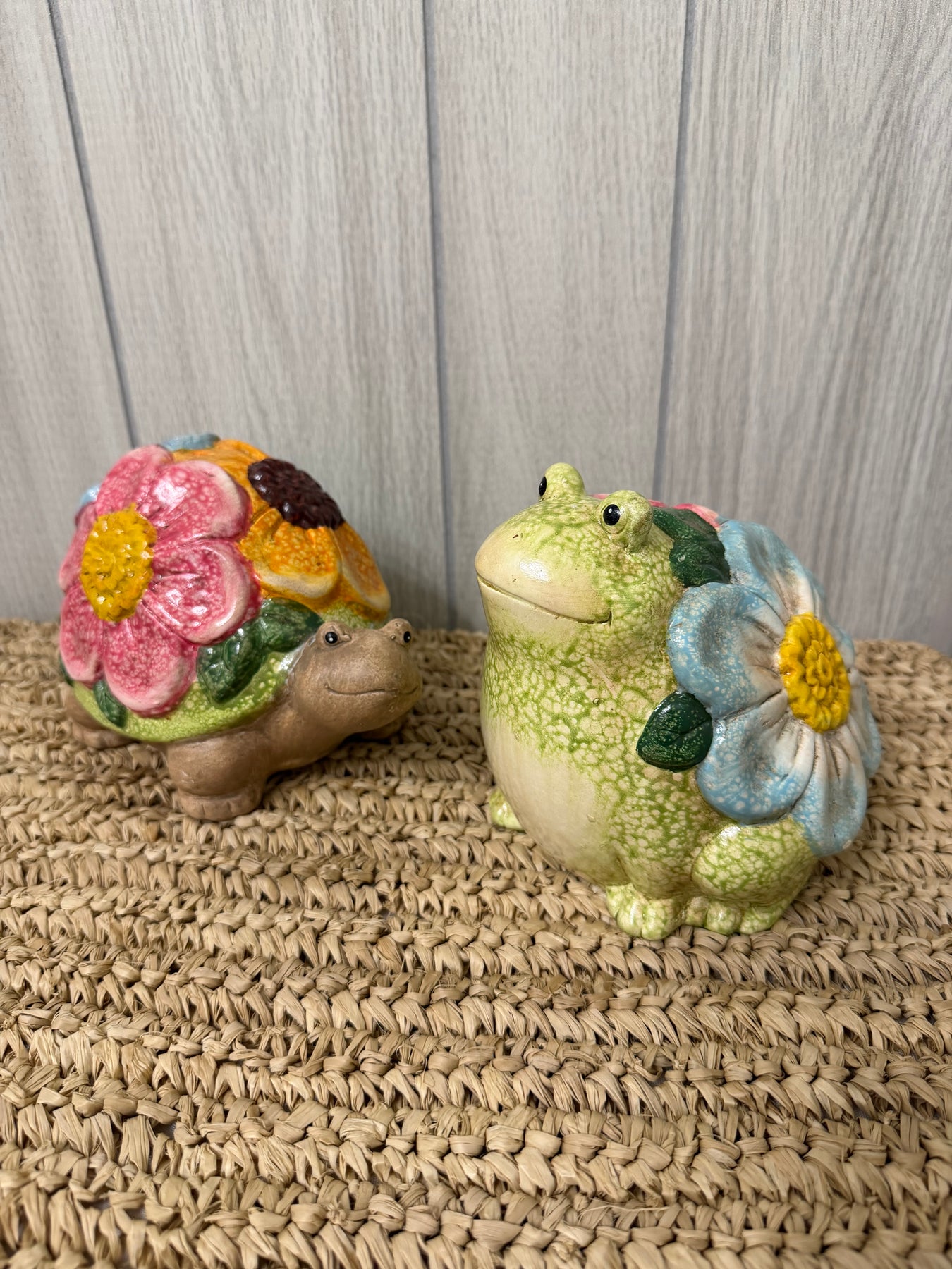 Playful and full of springtime charm, the Blossom Garden Frog & Turtle Figurines bring personality and color to any space. Each whimsical piece features a smiling frog or turtle adorned with a vibrant bouquet of sculpted flowers across its shell, finished in cheerful hues of blue, pink, yellow, and soft green. The textured, hand-painted details give these pieces a handcrafted, storybook feel that instantly brightens shelves, planters, and tabletops.