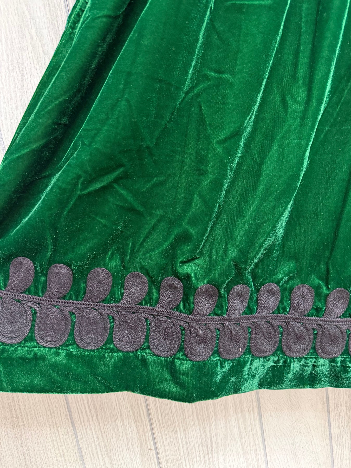 The Emerald Eve Embroidered Velvet Dress captures the spirit of the season with its rich jewel-toned hue and exquisite detailing. Made from sumptuous emerald green velvet, this dress features soft puff sleeves and striking black floral embroidery that adds a touch of vintage romance. The gathered waist and flowy skirt offer a flattering, comfortable fit, while the subtle back button closure keeps the look classic and refined.