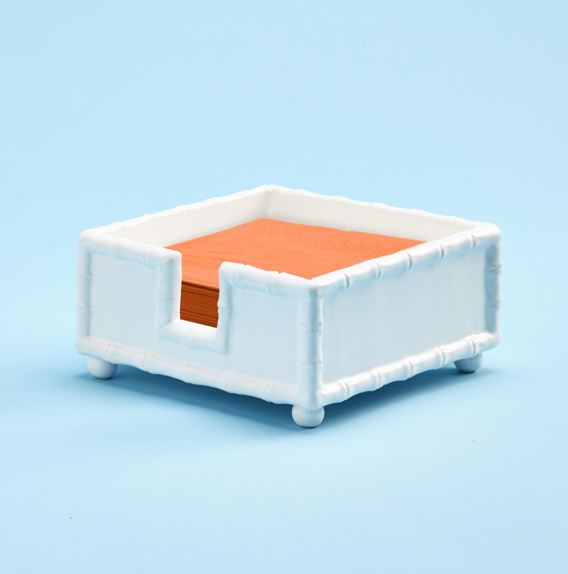 This faux bamboo cocktail napkin holder is a chic and functional accent for entertaining and everyday use. Finished in glossy white with bamboo-inspired detailing and petite feet, it brings a classic, coastal feel to bars, coffee tables, and powder rooms. The open-front design allows for easy access while keeping napkins neatly contained.