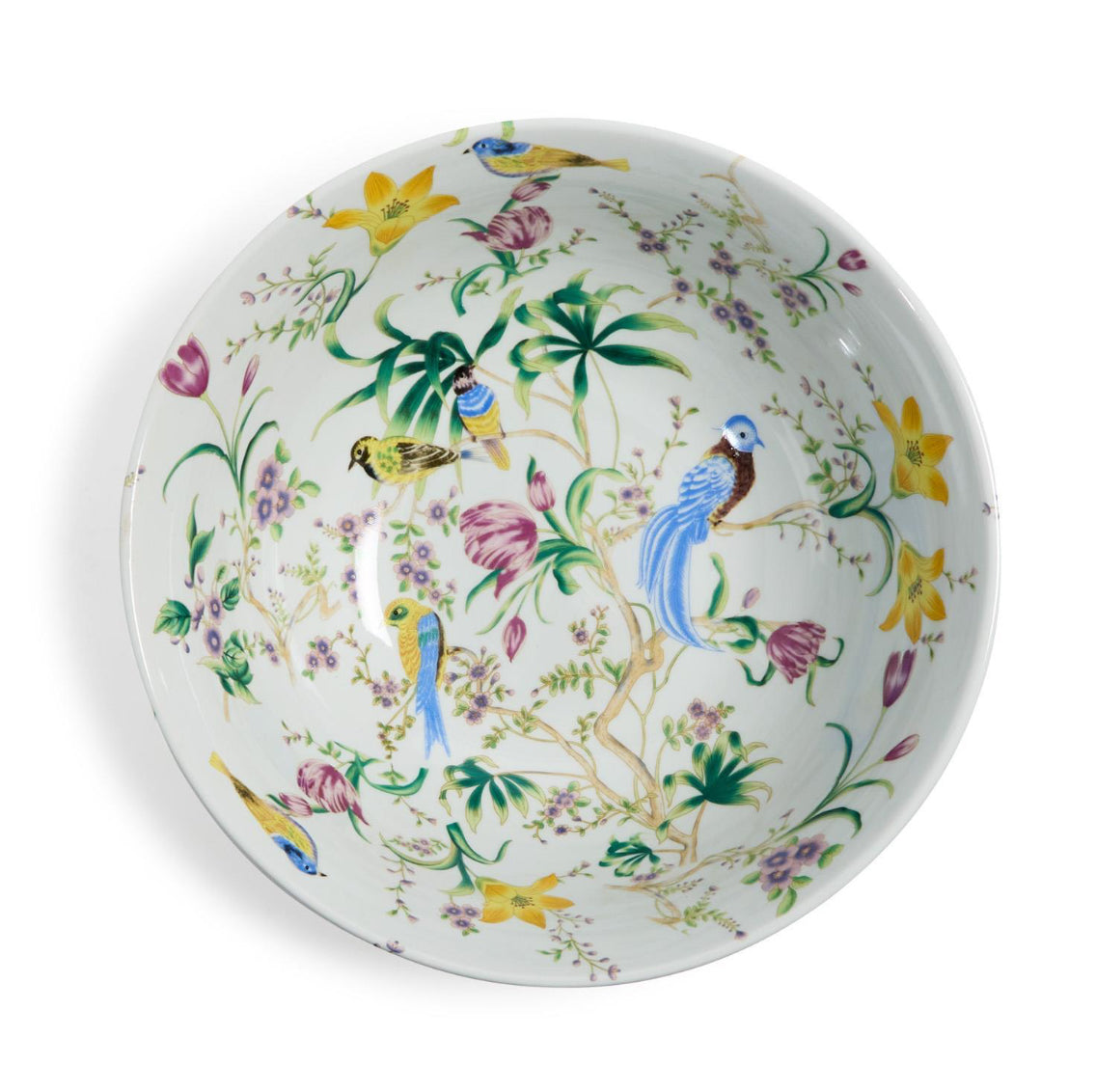 This is not just a bowl—it’s a statement piece. Meticulously crafted from fine ceramic, this oversized bowl features an exquisite, hand-painted scene of delicate florals and graceful birds, rendered in soft, museum-worthy hues. Every angle reveals thoughtful detail, from the flowing branches to the lifelike movement of each bird, making it feel more like a collectible work of art than serveware.