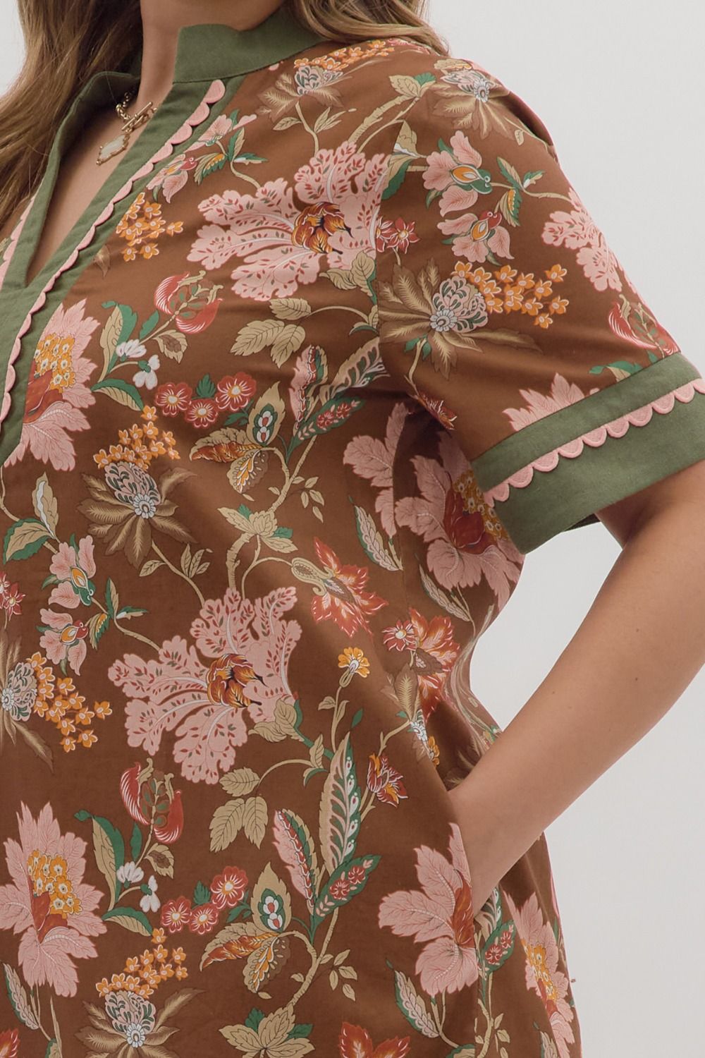 Celebrate the beauty of the season in our Harvest Blooms Tunic Dress, thoughtfully designed in a flattering plus-size silhouette. This stunning floral dress is where comfort meets elegance—crafted in a silky, lightweight fabric with a warm chestnut brown base, and adorned with a vintage-inspired garden of soft blush pink, coral, olive, and mustard blooms.