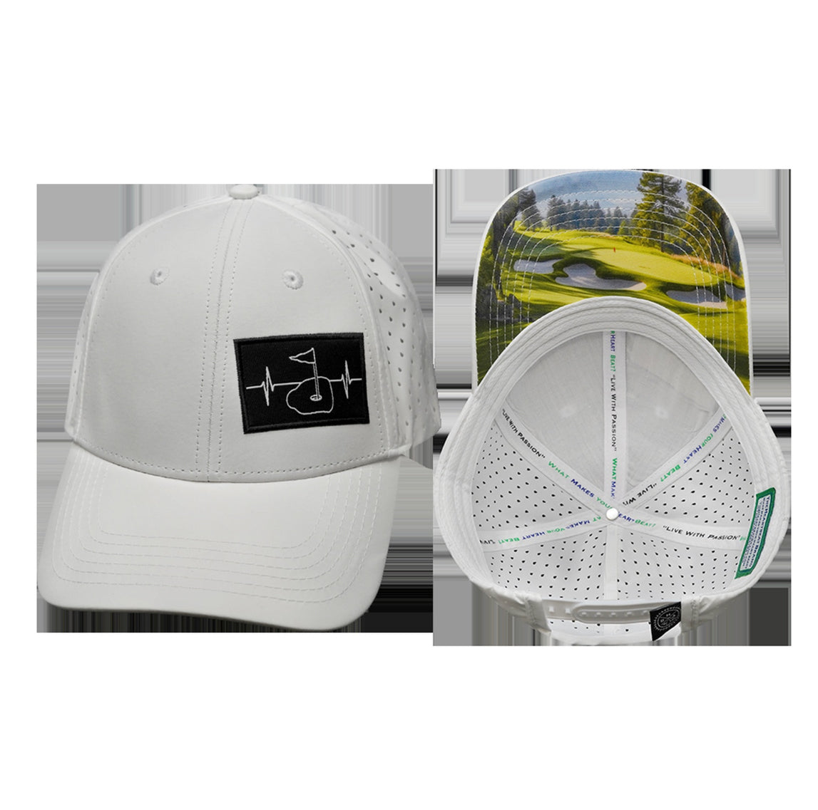 Designed for those who live for the game, the Heartbeat Golf Ponytail Performance Cap represents what your heart beats for—golf. Featuring the signature heartbeat-and-flag emblem, this performance-driven cap blends sporty function with elevated style. A breathable perforated back panel keeps you cool on warm days, while the built-in ponytail opening offers a comfortable, practical fit made specifically for women. Turn the bill up to reveal the stunning golf-course artwork printed underneath, adding a refined finishing touch that sets this cap apart both on and off the course.