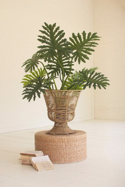 Bring grounded elegance and artisan texture into your space with the Iron & Seagrass Statement Urn. Featuring a sturdy iron frame wrapped in handwoven seagrass, this sculptural vessel blends earthy warmth with timeless structure. Its wide, fluted opening makes a dramatic base for dried florals, branches, or lush faux arrangements, creating an instant focal point in entryways, living rooms, or covered porches.