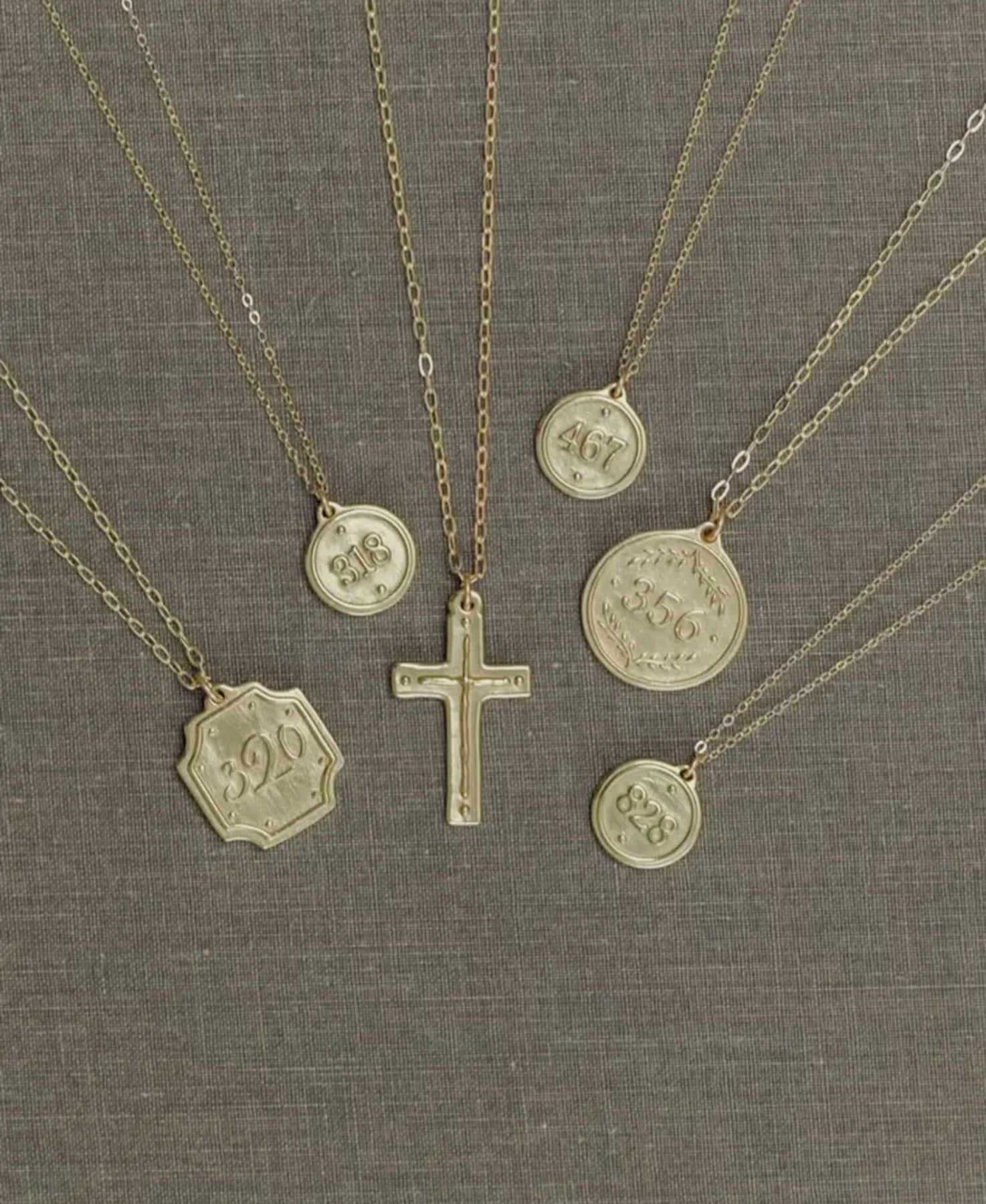 Multiple scripture-inspired designs are listed together and sold separately. Gold-filled chains with brass pendants.