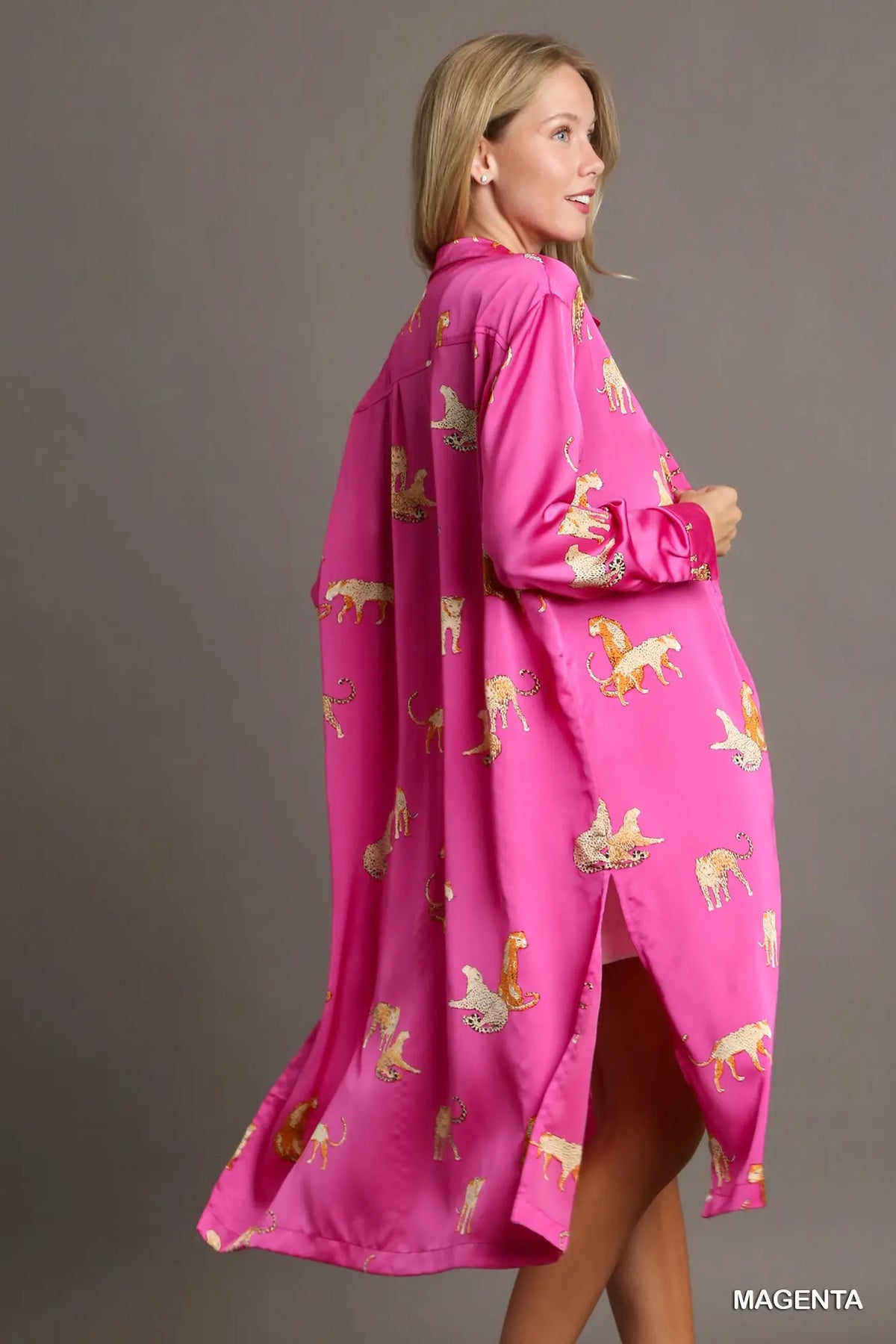 This versatile Magenta Tiger Button Up Dress can be styled as a dress or a kimono, making it perfect for any occasion. The luxurious design and print are sure to turn heads. Add a touch of elegance to your wardrobe with this beautiful and functional piece.