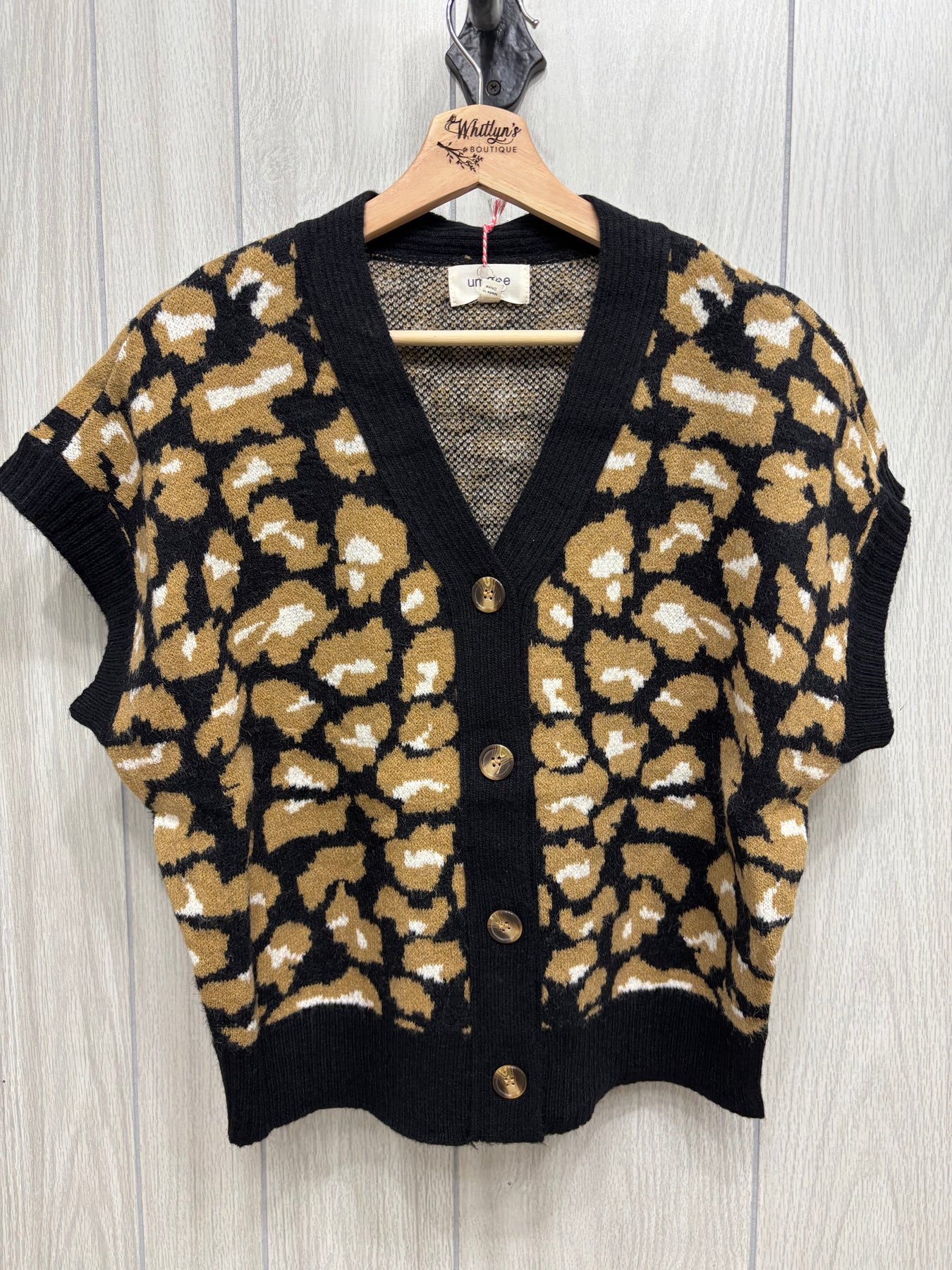 Bold and effortlessly cool, the Midnight Savannah Sweater Vest is your new layering statement. Featuring a rich black base with an abstract animal-inspired pattern in warm camel and soft ivory, this knit brings just the right amount of edge to a classic silhouette. The deep V-neckline and button-front design make it easy to style open or closed, while the short sleeves and relaxed fit give it a modern, wearable feel. Finished with solid black ribbed trim for contrast and polish, this vest pairs perfectly over a crisp button-down, a fitted tee, or worn solo for an elevated casual look. Equal parts cozy and fashion-forward, it’s a standout piece you’ll reach for again and again.