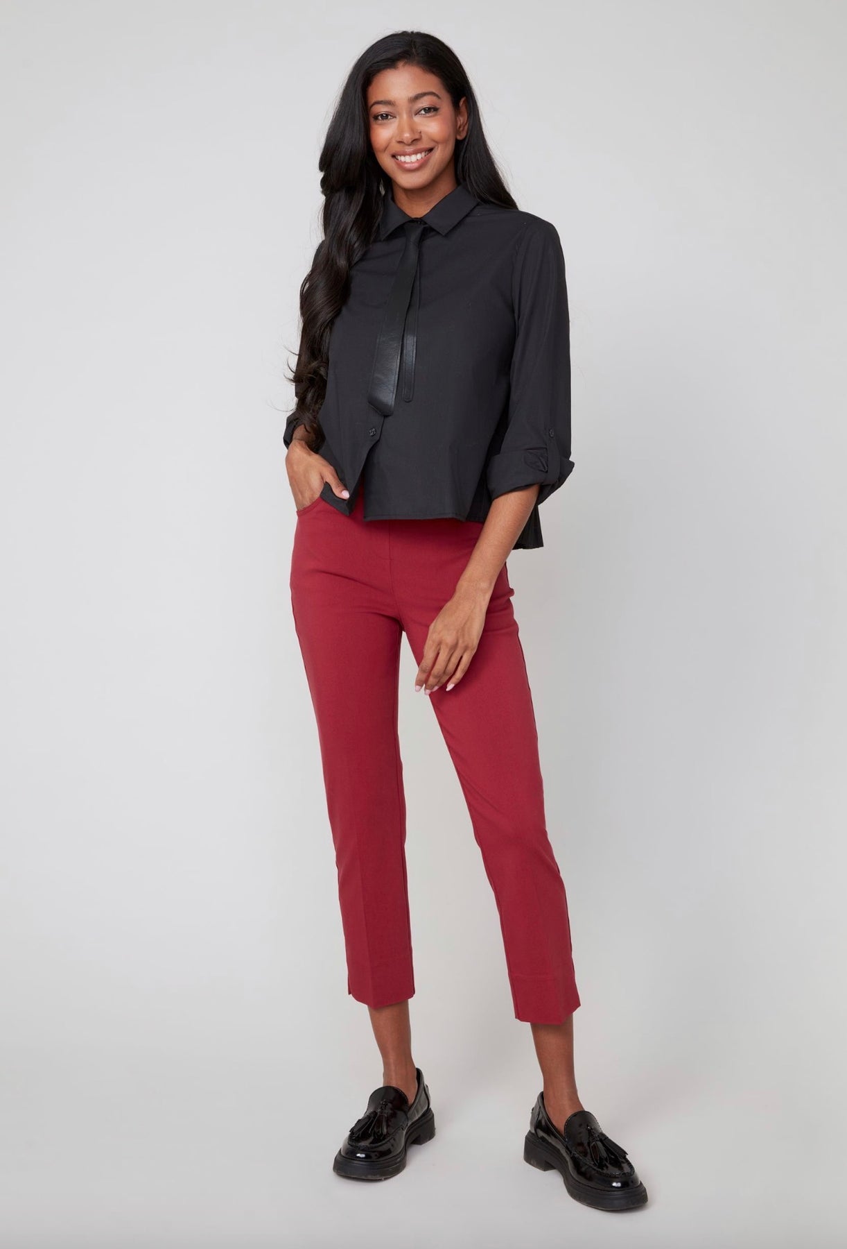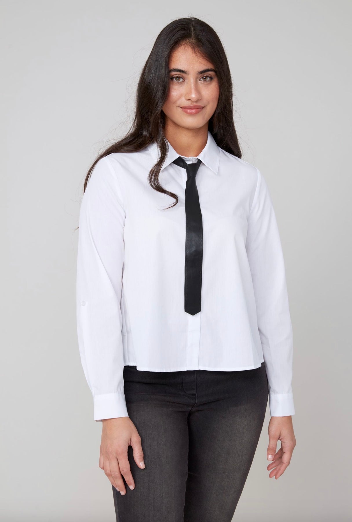 Designed with roll-tab sleeves and a slightly cropped hem, it’s equally chic tucked into tailored pants or worn loose with denim. Finished with a removable faux leather tie for a touch of edge.