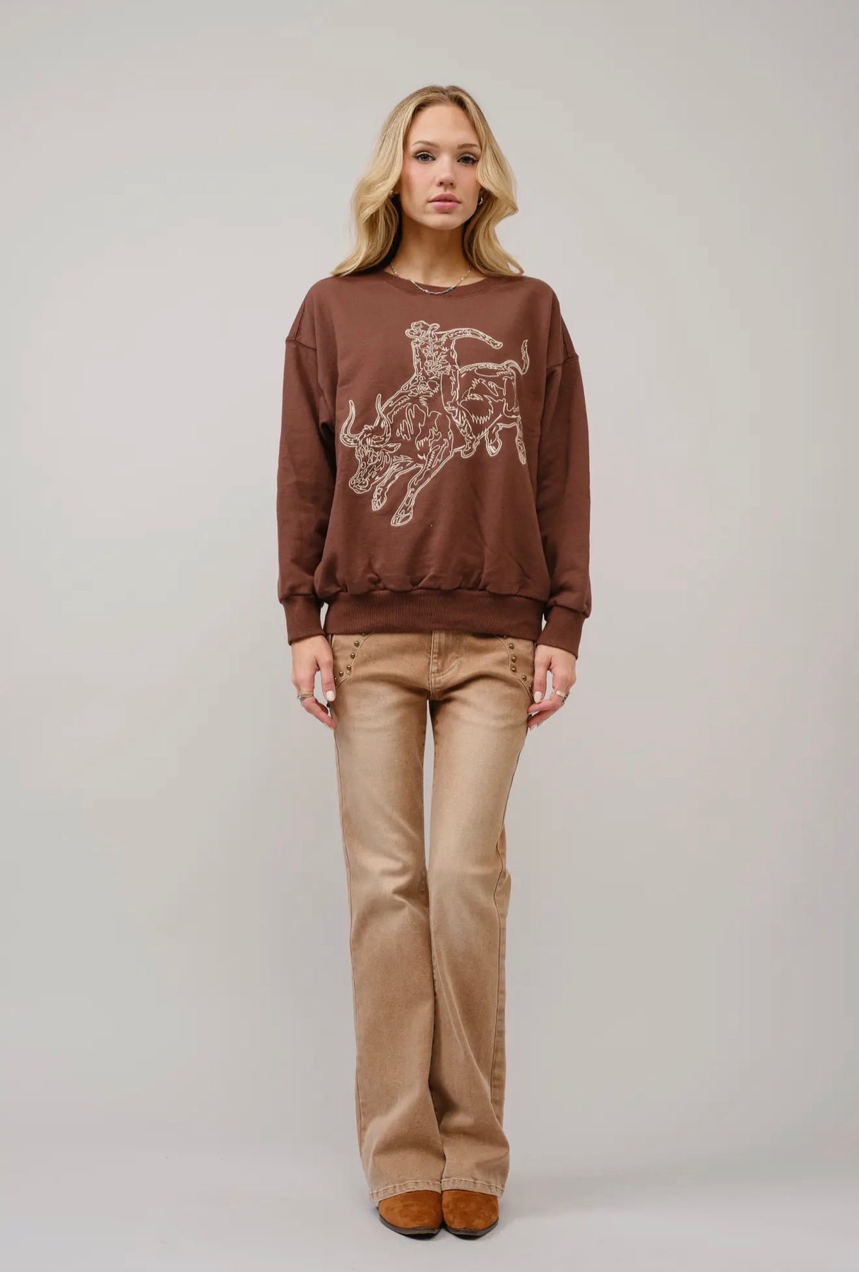 Channel your inner cowgirl with the Ride ‘Em Graphic Sweatshirt — a bold western-inspired piece that captures the heart of rodeo culture. The rich chocolate brown hue sets the perfect backdrop for the line-art graphic of a bull rider mid-ride, creating a striking yet wearable statement.
