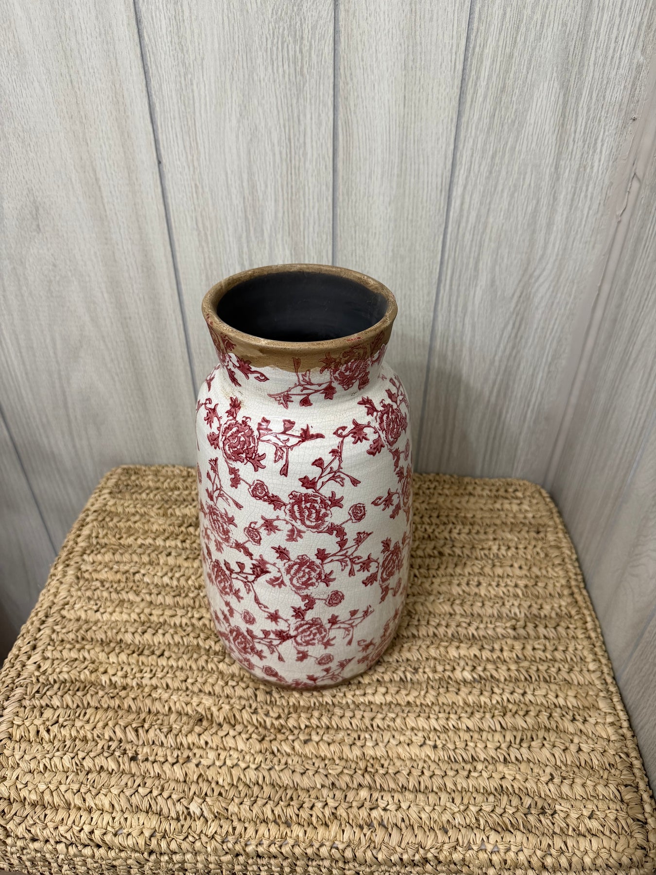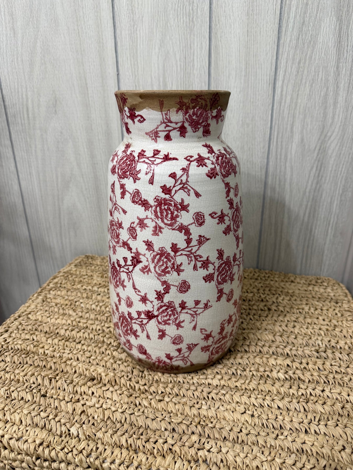 Graceful and timeless, the Rose Toile Stoneware Vase brings classic European elegance into any space. Standing 12.6 inches tall, this beautifully crafted vase features a soft ivory crackle glaze layered with deep red floral toile artwork, creating a look that feels both romantic and refined. The gently tapered neck and subtly weathered rim add to its old-world charm, giving the piece the character of a cherished antique.