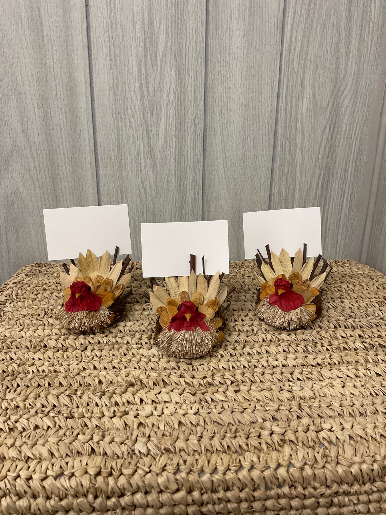 Add a festive farmhouse touch to your Thanksgiving table with these Rustic Turkey Place Card Holders. Each turkey is handcrafted from natural materials with layered feathers, straw detailing, and a charming rustic finish — perfect for creating a warm, welcoming fall tablescape.