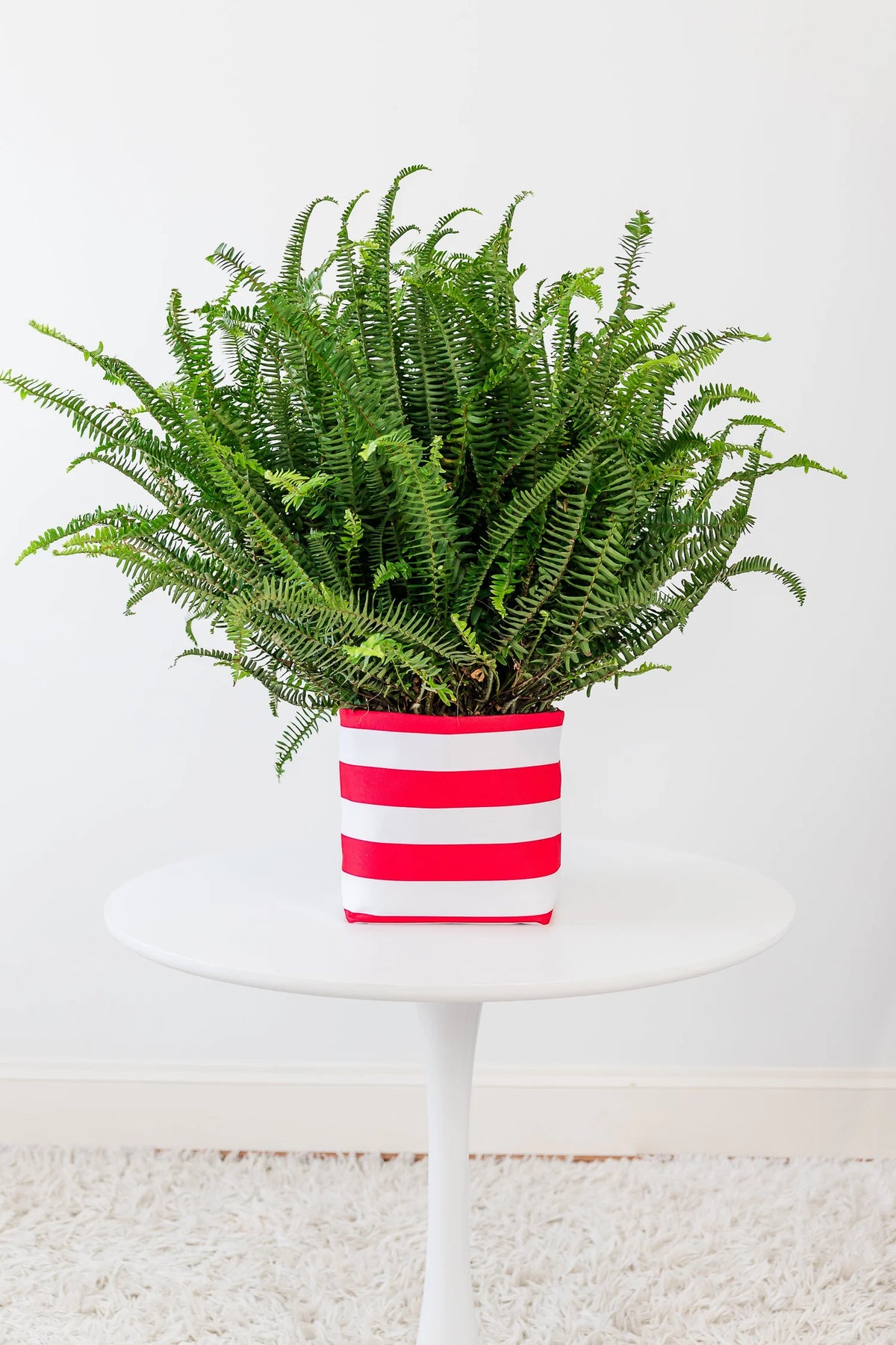 Crafted with structured fabric and eye-catching patterns—from classic black and white stripes to elegant damask and cheerful peppermint red—they instantly bring polish and personality to your porch, kitchen counter, sunroom, or fireplace hearth. Use them to coordinate your plants with your holiday décor, wrap your poinsettias in boutique-worthy charm, or gift them filled with greenery for an unforgettable hostess surprise.