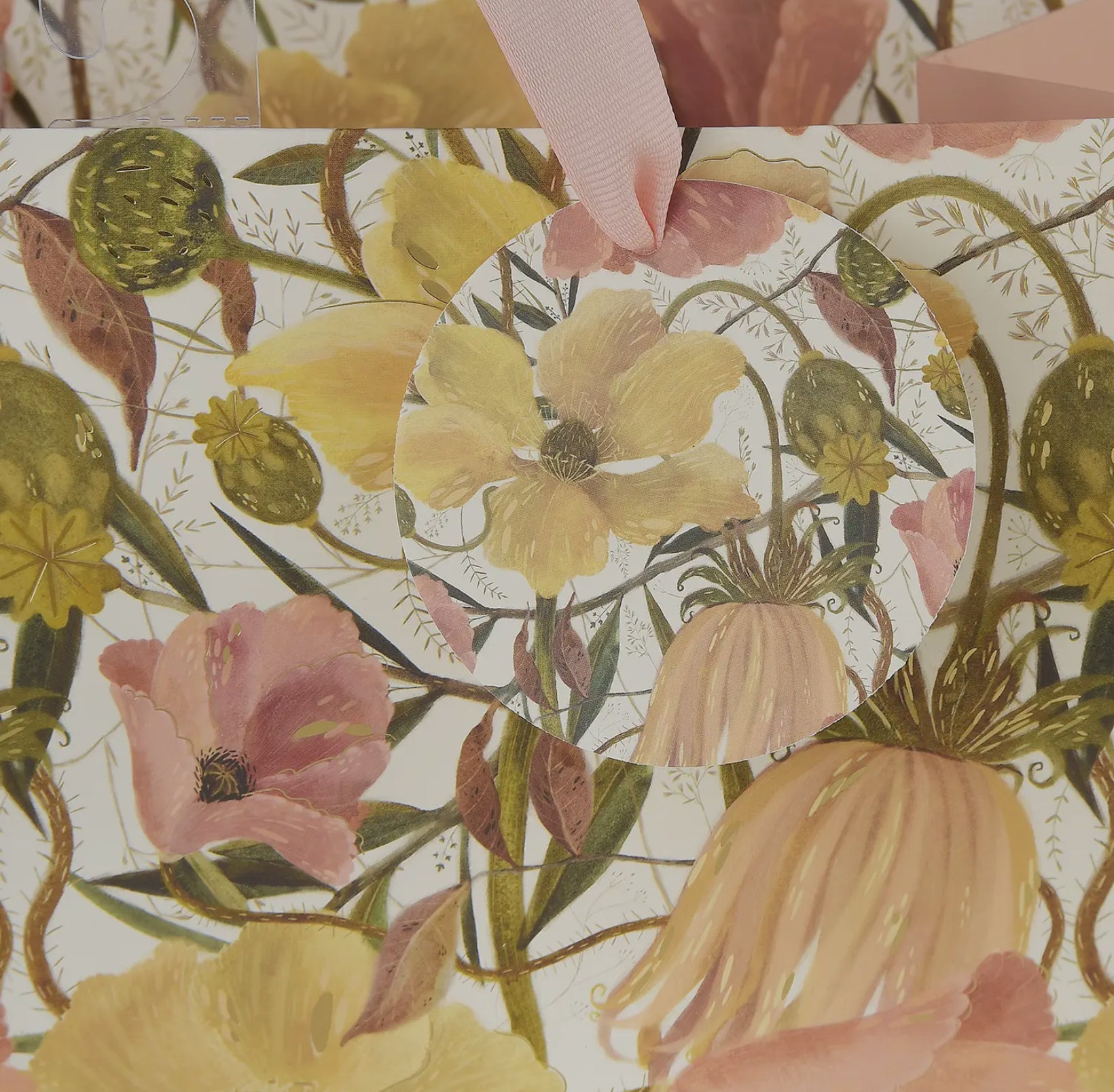 Add a delicate, graceful touch to your gift presentation with the Soft Petals Gift Bag, featuring a light botanical design of warm blush and golden florals set against a soft neutral background. Finished with coordinating ribbon handles and a matching gift tag, this bag offers an elegant yet cheerful look perfect for birthdays, showers, celebrations, or everyday boutique gifting. Its sturdy construction makes it ideal for apparel, candles, books, or thoughtfully curated gift sets.