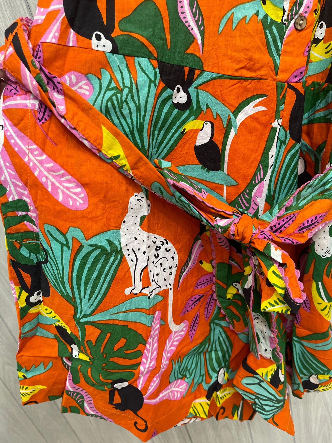 Introducing the Tropicana Romper. Made for summer vacations, this lightweight and stylish romper features a tropical theme and comes with a convenient belt tie. Perfect for staying cool and fashionable on your next getaway.