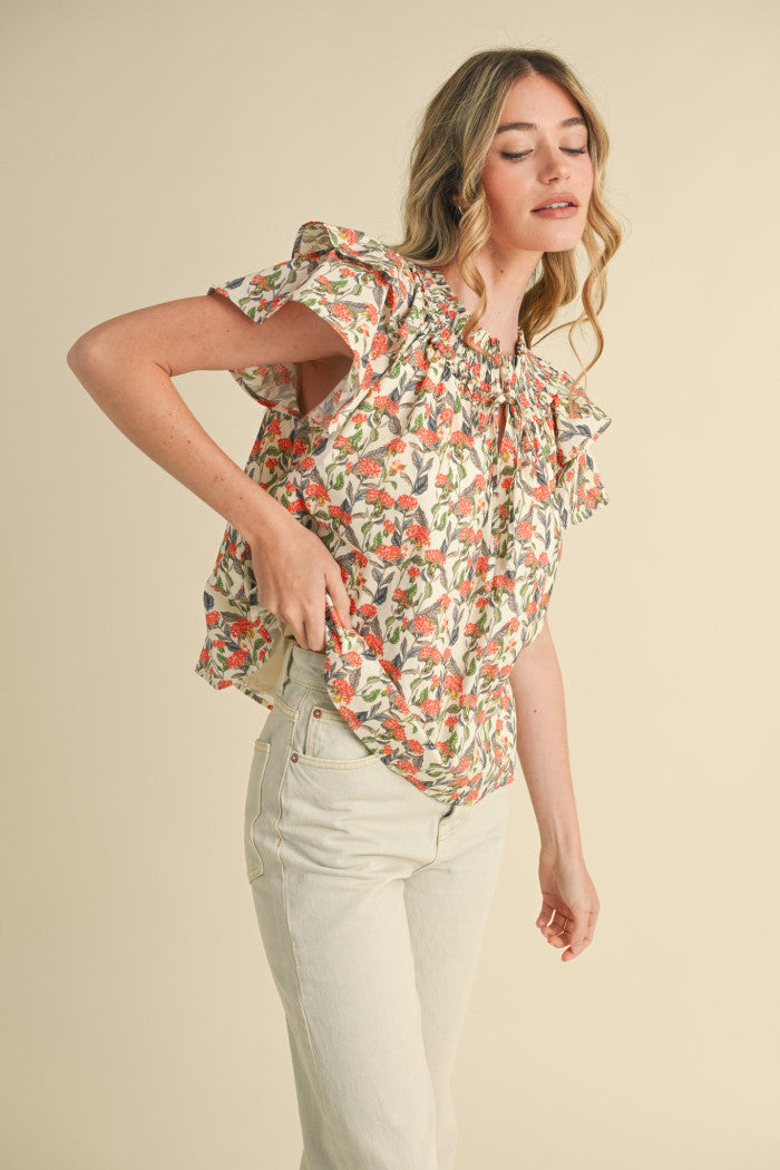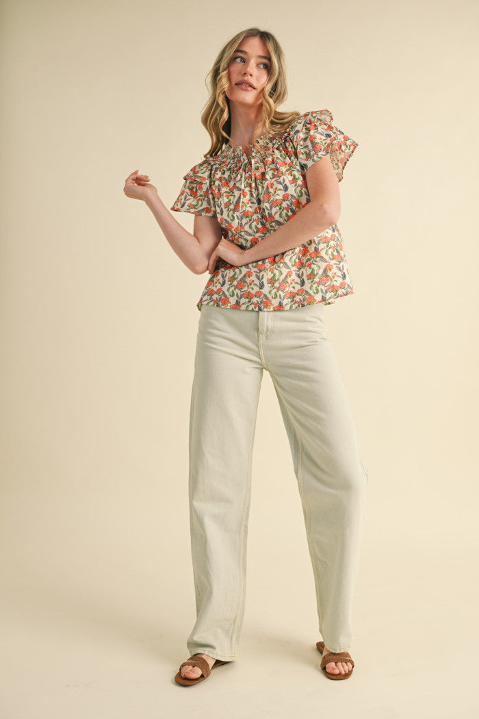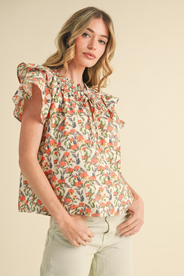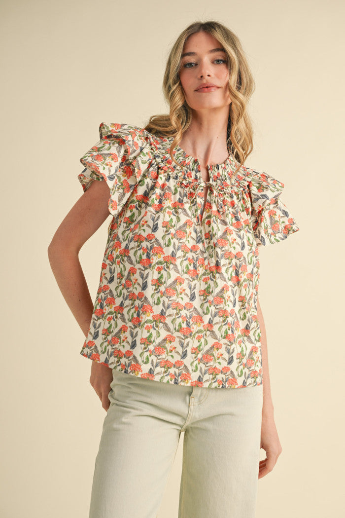 You'll be the sweetest thing in this floral flutter sleeve top! Lightweight woven fabric (with a floral print throughout) shapes a smocked neckline with a notched V and tying detail. Breezy, relaxed bodice is framed by short, layered flutter sleeves.