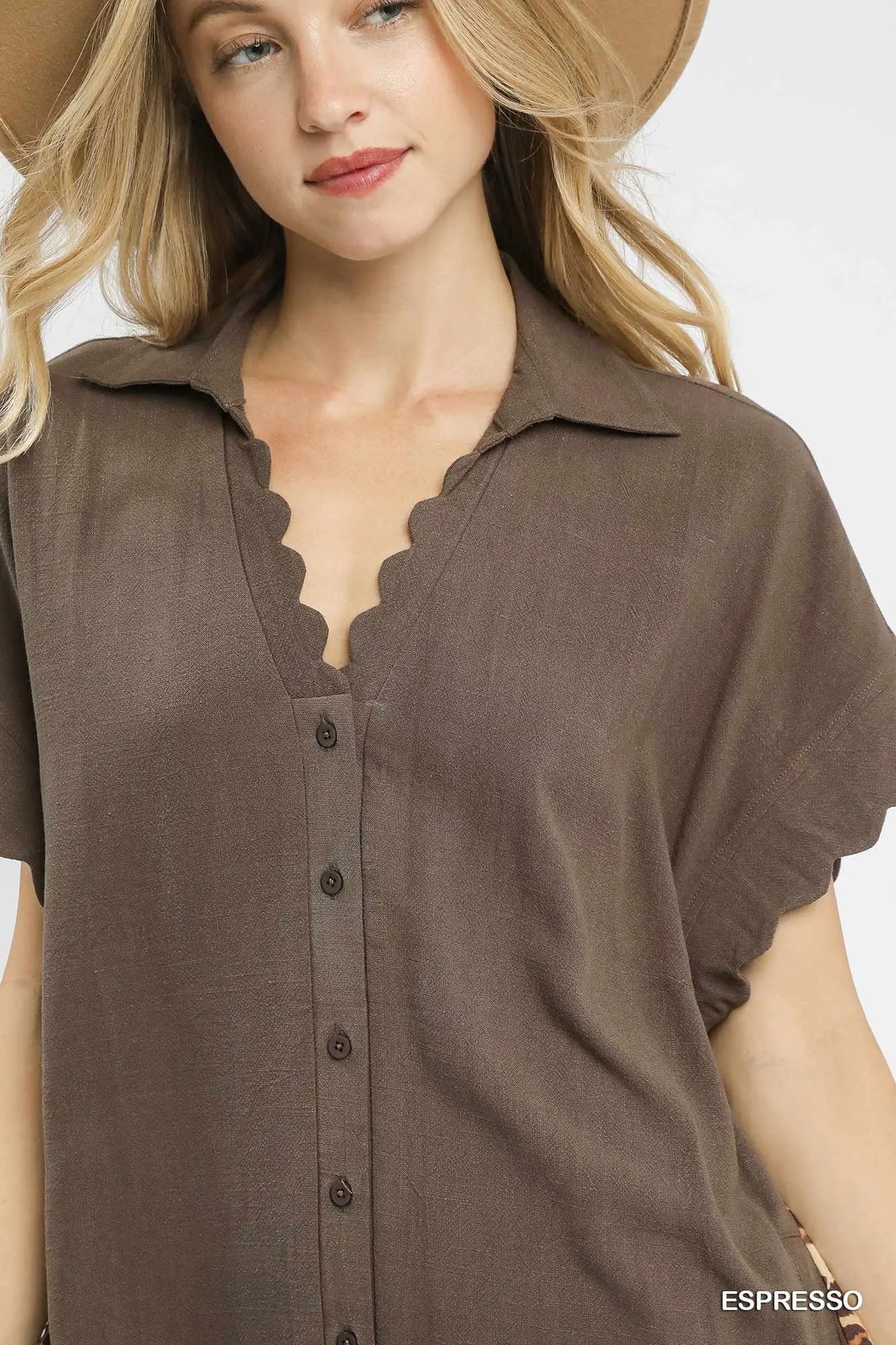 Details: Button-front design, scalloped neckline, flutter sleeves, leopard-print back panel
