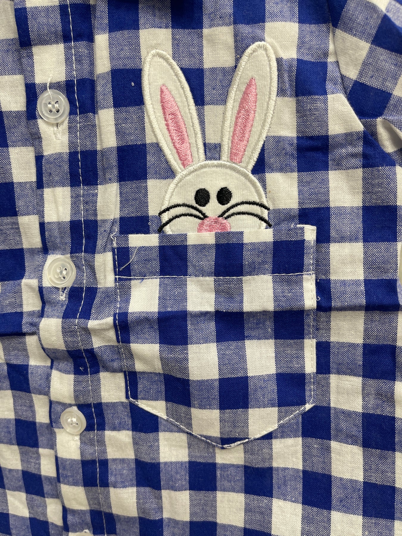 Adorable little button up with the cutest bunny popping out of the pocket. So great for spring and Easter!