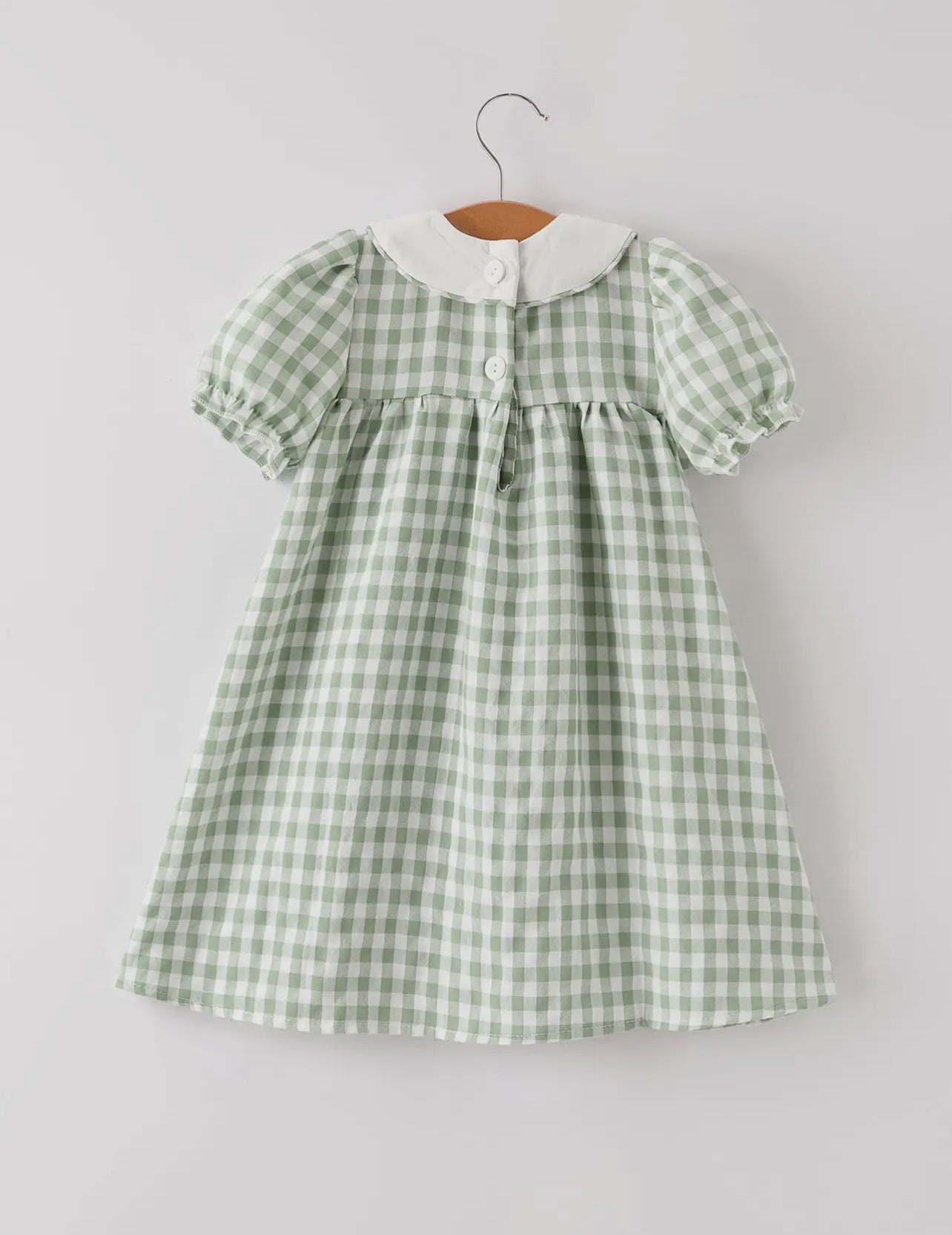 Harvest the cuteness with our Pumpkin Patch Princess Dress — the sweetest little gingham moment for your mini this fall! Crafted in a soft sage green and white check print, this dress brings together timeless southern charm and festive flair.