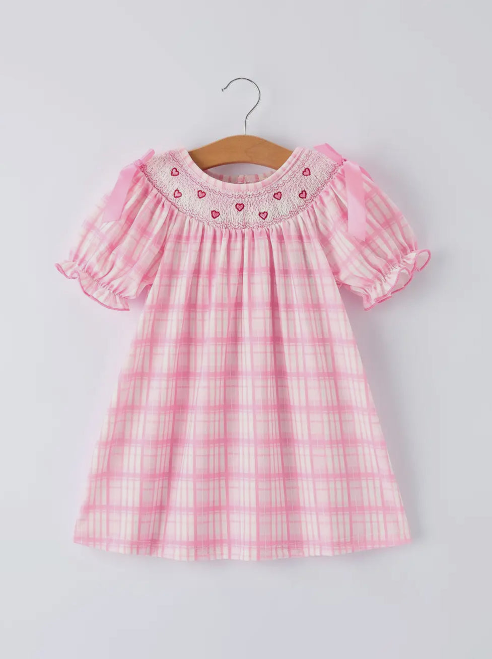 Soft, sweet, and made for twirling, the Pink Picnic Heart Smocked Dress is a timeless treasure for little girls. Designed in a delicate pink plaid, this darling dress features a beautifully hand-smocked neckline embroidered with tiny hearts for a subtle Valentine-inspired touch. The puff sleeves with gentle ruffle trim and sweet ribbon accents at the shoulders add extra charm, while the airy silhouette keeps it comfy for all-day wear. Finished with button details at the back for easy dressing, this dress is perfect for special occasions, family photos, or simply feeling extra pretty on an everyday outing. Classic, precious, and full of love, it’s a piece you’ll cherish season after season. 💕