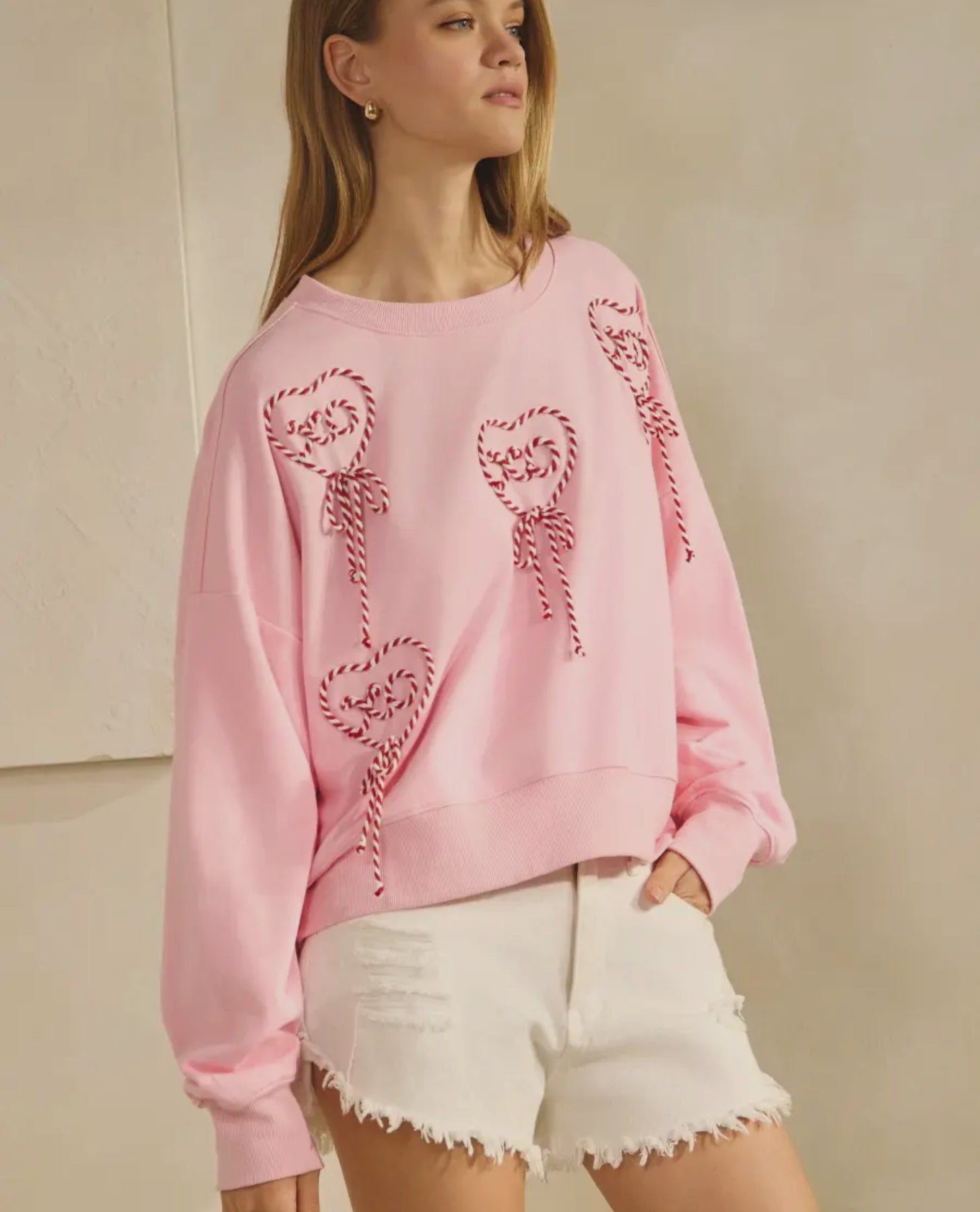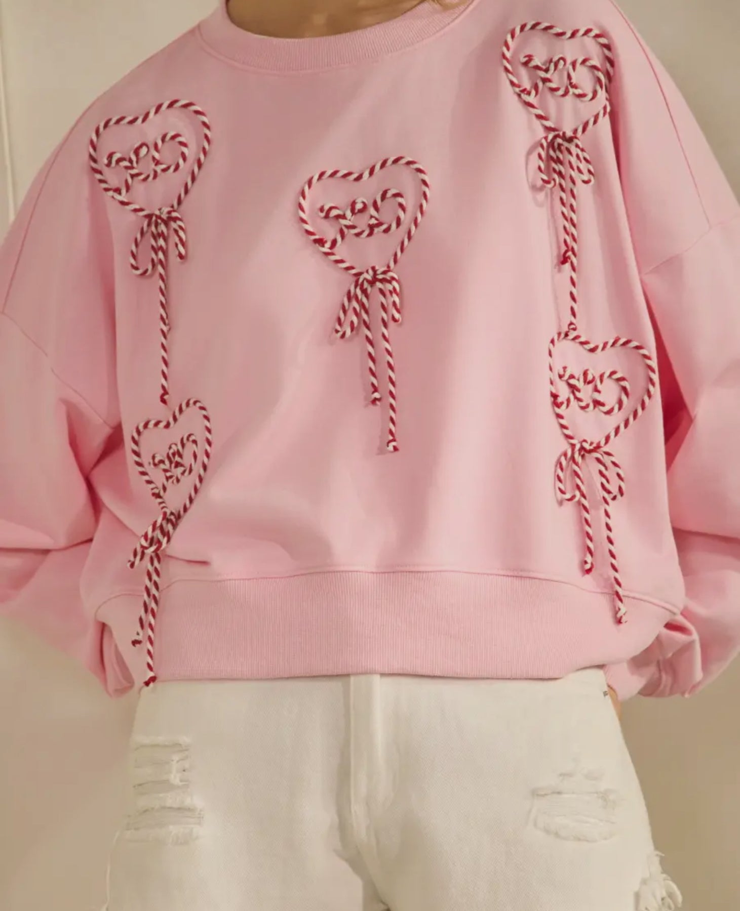 Playful with a polished boutique twist, the Sweetheart Candy Rope Sweatshirt is the perfect blend of cozy and eye-catching. Crafted in a soft blush pink, this sweatshirt features dimensional rope embroidery throughout, forming whimsical heart motifs that feel both fun and elevated. The textured detailing adds instant charm while keeping the overall look clean and wearable.