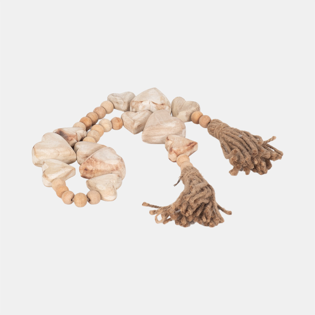 The Sweetheart Wood Bead Garland adds a warm, charming touch to any space with its soft neutral tones and hand-carved heart beads. Crafted with natural wood beads and finished with rustic jute tassels on each end, this piece brings an inviting, cozy feel that works beautifully year-round—especially for Valentine’s Day, spring styling, or everyday décor.