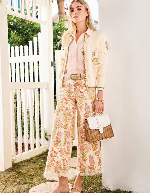 Make a statement with the Pritchard Wide Leg Fringe Pull-On Jean in Castillo Toile Cream—where effortless comfort meets standout style. Featuring a beautifully detailed toile print in soft, warm tones, this piece brings an elevated, artistic feel to a relaxed silhouette.