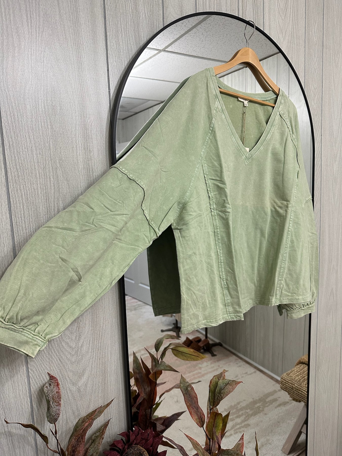 Effortlessly cool and irresistibly comfortable, our Sage Mineral Washed Sweater is the laid-back essential your wardrobe’s been waiting for. The relaxed fit drapes beautifully, while the soft mineral-washed cotton gives it that perfectly lived-in feel from day one. With a flattering V-neckline, dropped shoulders, and gently billowed sleeves, it’s the ultimate blend of casual charm and understated style. Pair it with your favorite jeans for a cozy weekend vibe or layer it over a slip dress for a boho-chic twist.