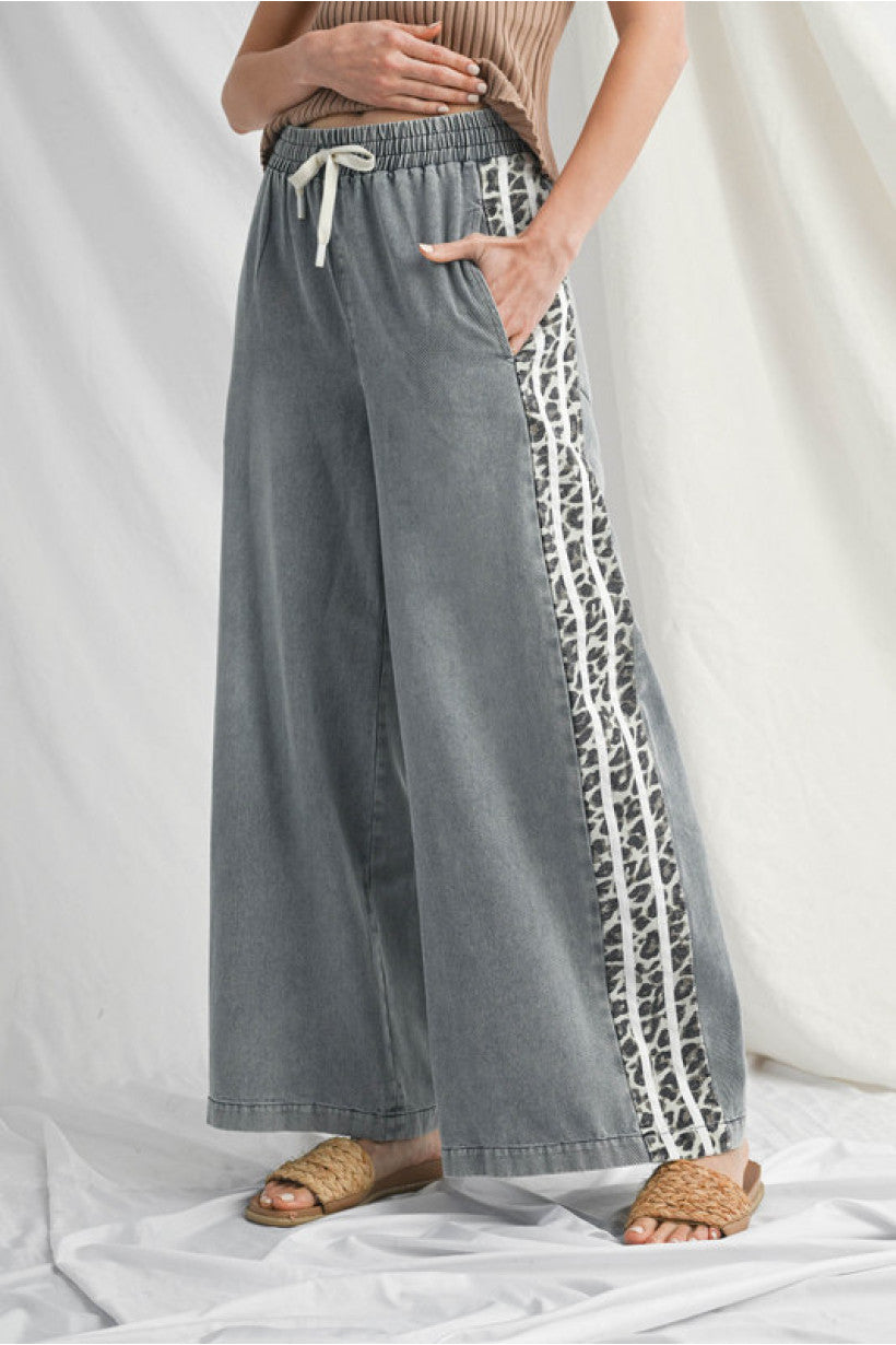 Elevate your everyday denim with the Side Stripe Denim Lounge Pants—where laid-back comfort meets standout style. These soft washed wide-leg jeans feature a relaxed, flowy silhouette with a drawstring waistband for the ultimate in all-day ease. Down the sides, a bold pop of leopard print framed by cream ladder lace adds an unexpected twist, giving these pants an effortlessly cool, boutique-worthy vibe. Finished with pockets and a breezy cropped hem, they’re perfect with everything from tanks to oversized sweaters.