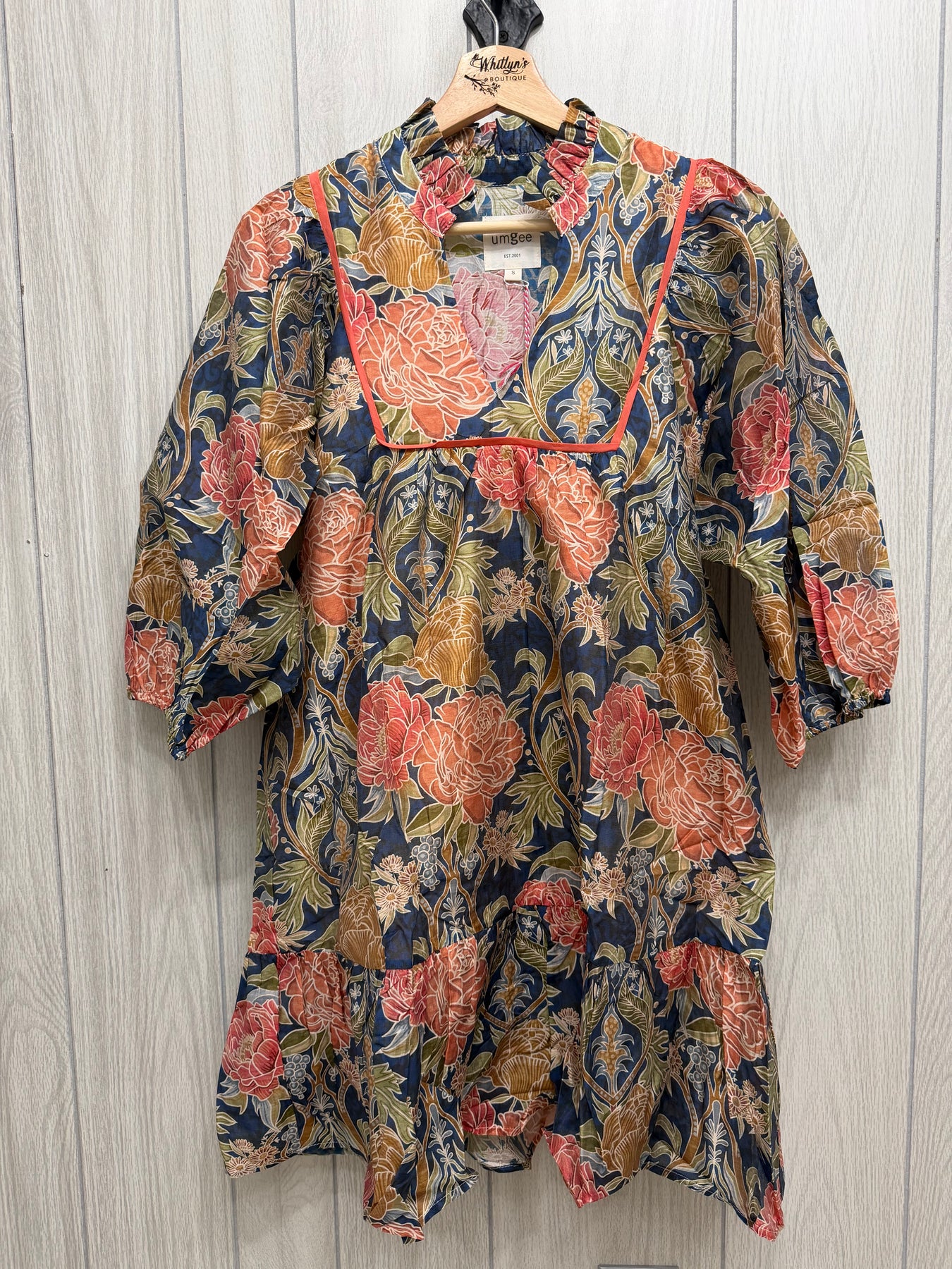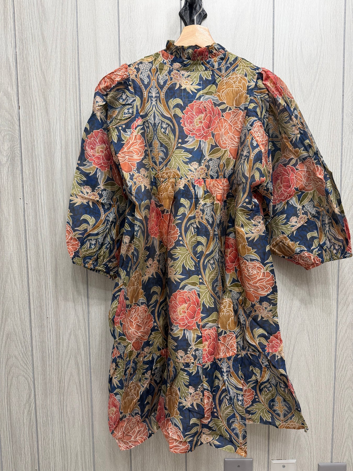 Bold, botanical, and brimming with vintage charm — the Autumn Garden Ruffle Neck Dress makes an effortless statement. Featuring a rich navy backdrop layered with intricate floral patterns in burnt orange, sage green, and blush pink, this dress blends fall’s favorite tones with timeless romantic detail. The high ruffle neckline and billowy ¾ sleeves add a touch of drama, while the squared yoke framed in coral piping adds contrast and structure to the breezy silhouette.