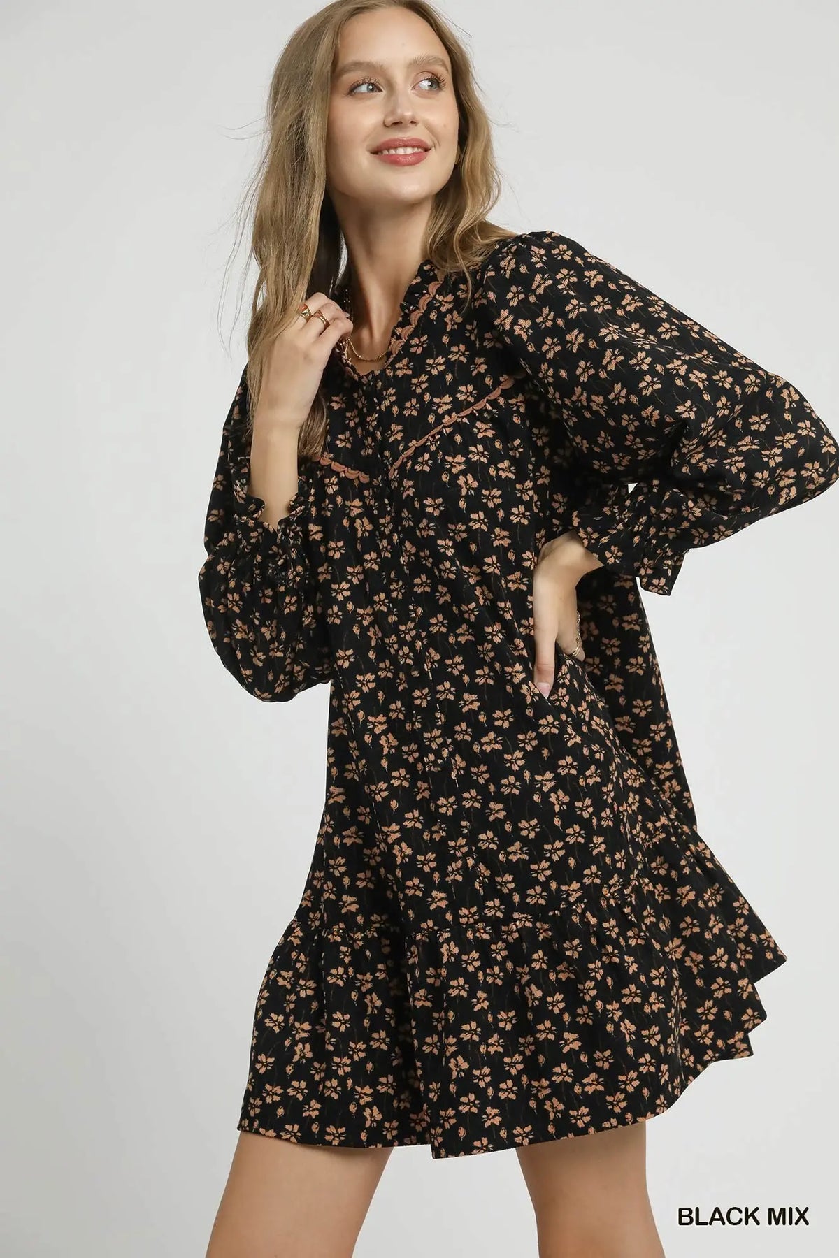 Flirty, fun, and effortlessly chic—our Ditsy Floral Babydoll Dress in Black Mix is a go-to piece for every season. With its vintage-inspired micro floral print in warm blush tones, this flowy mini is full of personality. The soft ruffled collar, tiered skirt, and dainty scalloped trim bring just the right amount of sweetness, while the long sleeves with elasticized cuffs keep it comfy and cute. Whether you throw on a denim jacket or pair it with boots and tights, this dress brings laid-back charm to cooler weather. Think coffee runs, dinner dates, or girls’