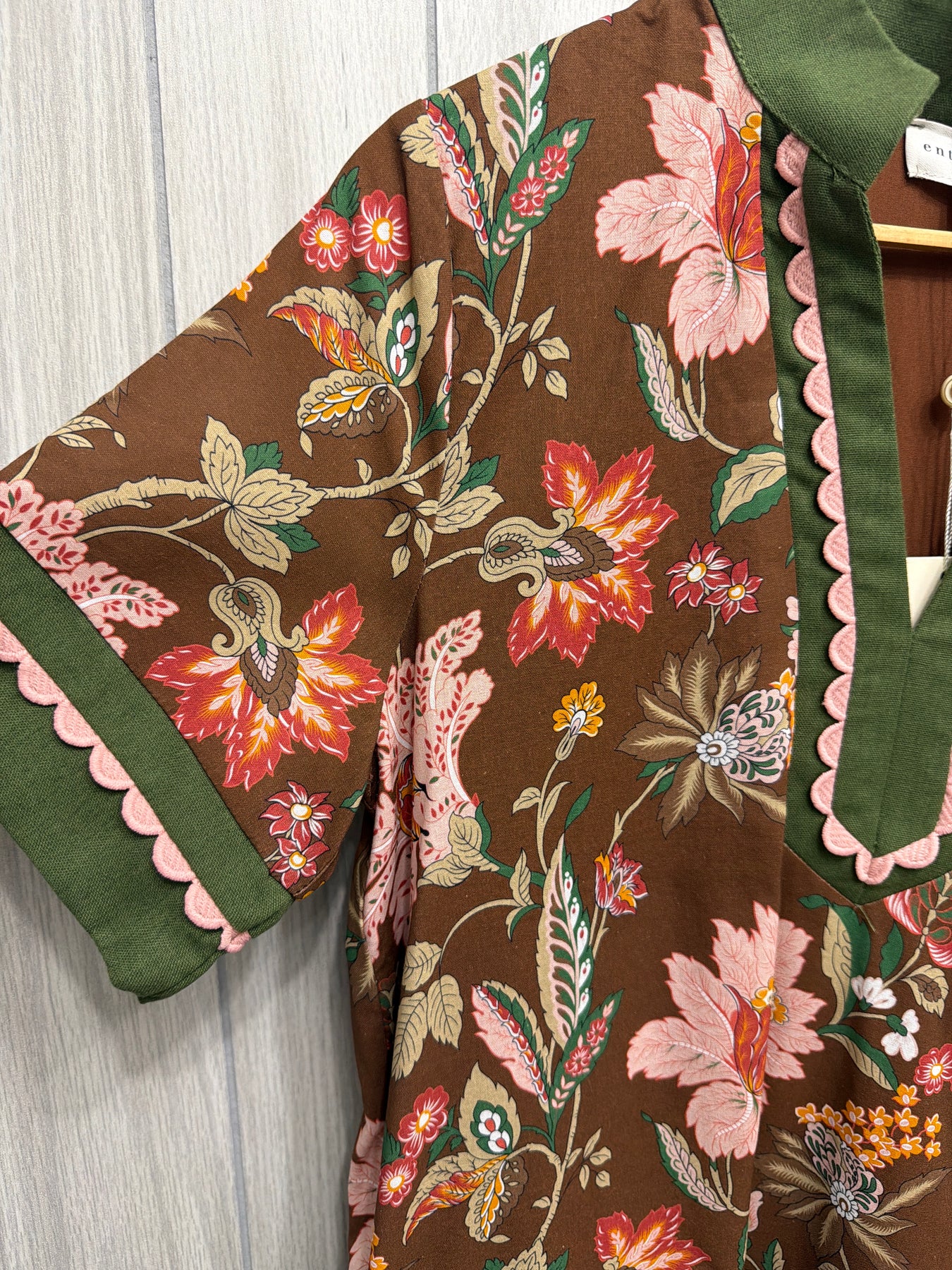 The contrast olive green trim at the collar, cuffs, and hem is accented with the most darling pink scalloped detail—bringing a charming, boutique finish to this easy-to-wear favorite. A mandarin-style collar and notched V-neckline draw the eye upward, while the loose-fitting shape flows beautifully over curves for a comfortable, confident fit.