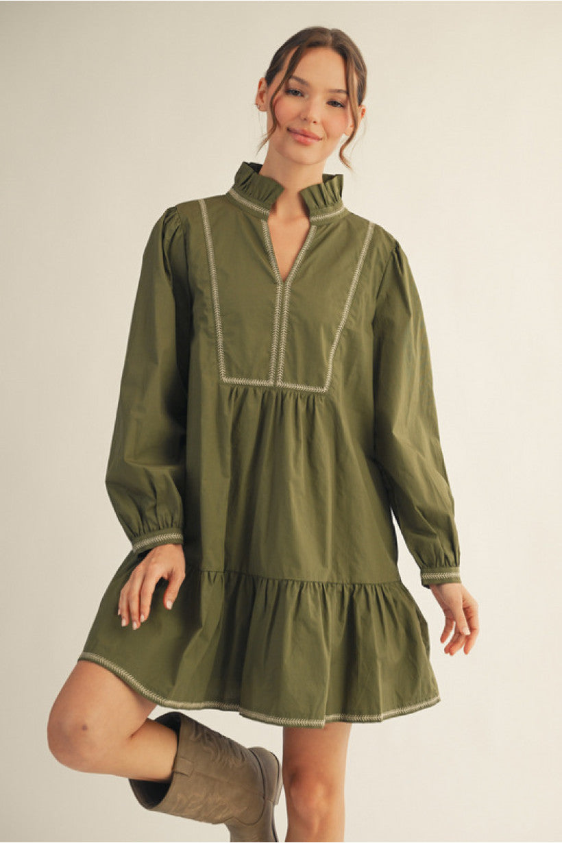 Meet your new go-to for fall layering and effortless style—the Prairie Ruffle Poplin Dress in a rich olive green. With its easy tiered silhouette and lightweight crisp poplin fabric, this dress balances simplicity with just the right amount of detail. The structured high ruffle neckline and stitched inset paneling down the chest and sleeves give it a heritage feel, while the roomy fit and flowy hem keep it modern and comfortable.