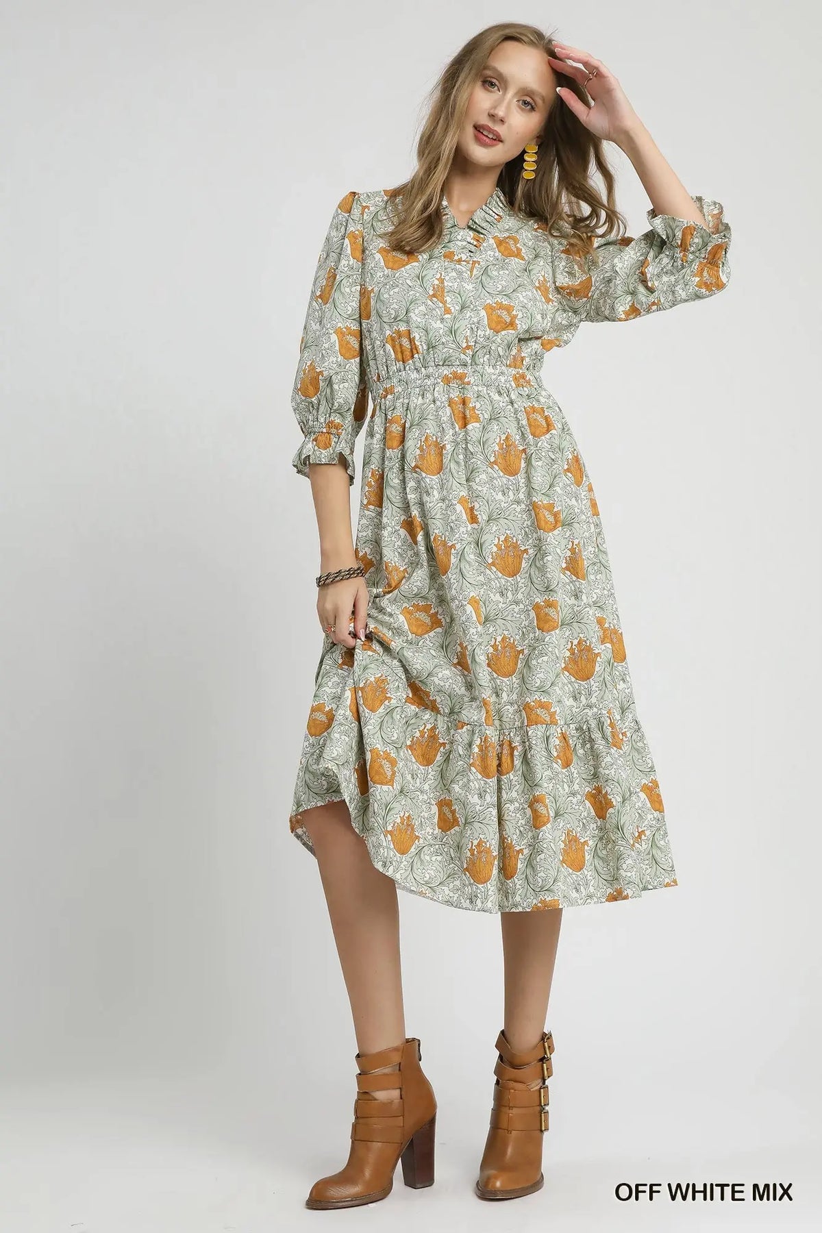 This romantic midi dress is where vintage-inspired charm meets effortless elegance. Featuring a whimsical floral print in soft sage and rich marigold tones, the Sunflower Bloom Ruffle Midi Dress brings an artful touch to cooler-weather dressing. The tiered silhouette is designed for comfort and flow, with a gently cinched waist and subtle ruffle details along the neckline and ¾ length sleeves.