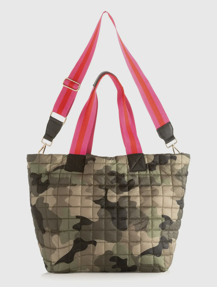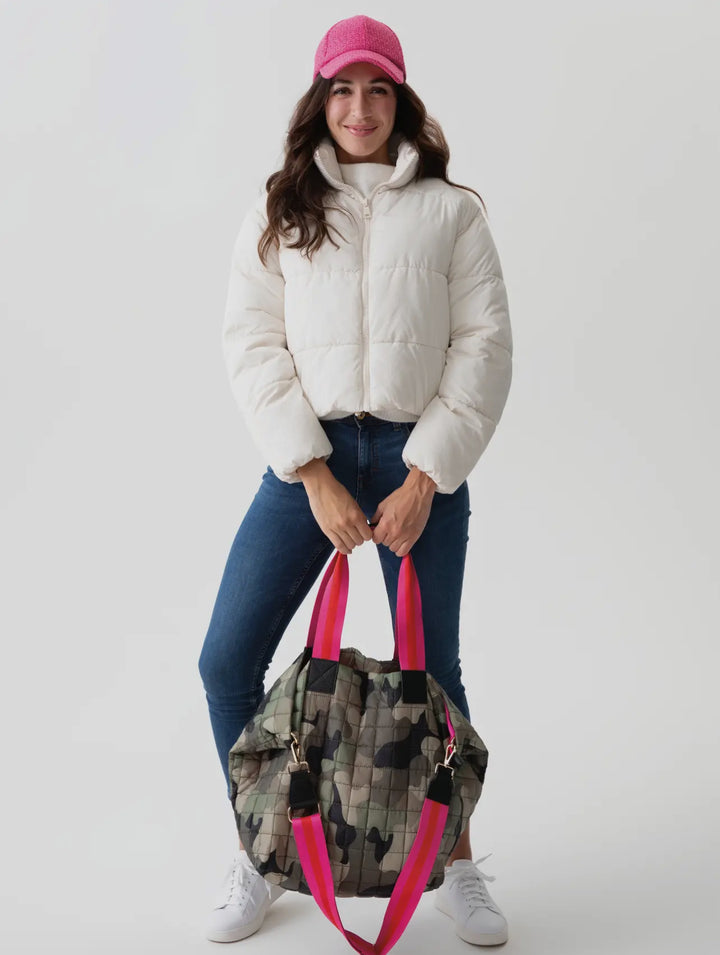 Meet your new go-to bag that’s anything but basic. The Ezra Camo Tote blends street-style edge with playful feminine flair, making it the ultimate statement piece for your everyday hustle. Crafted in a soft, quilted camo print, this tote is lightweight yet durable—perfect for busy days, gym runs, or spontaneous weekend getaways.