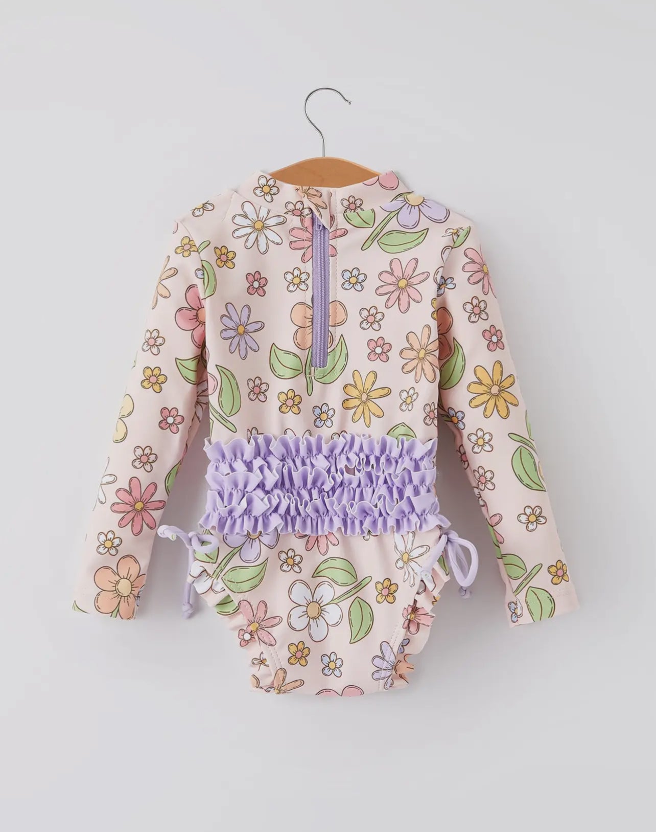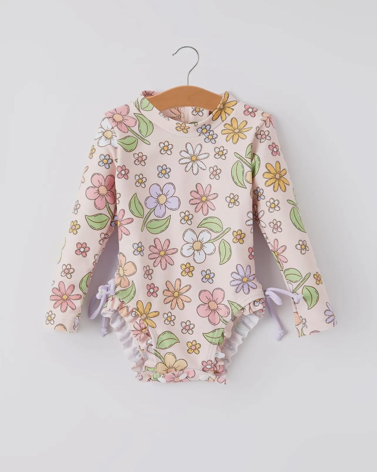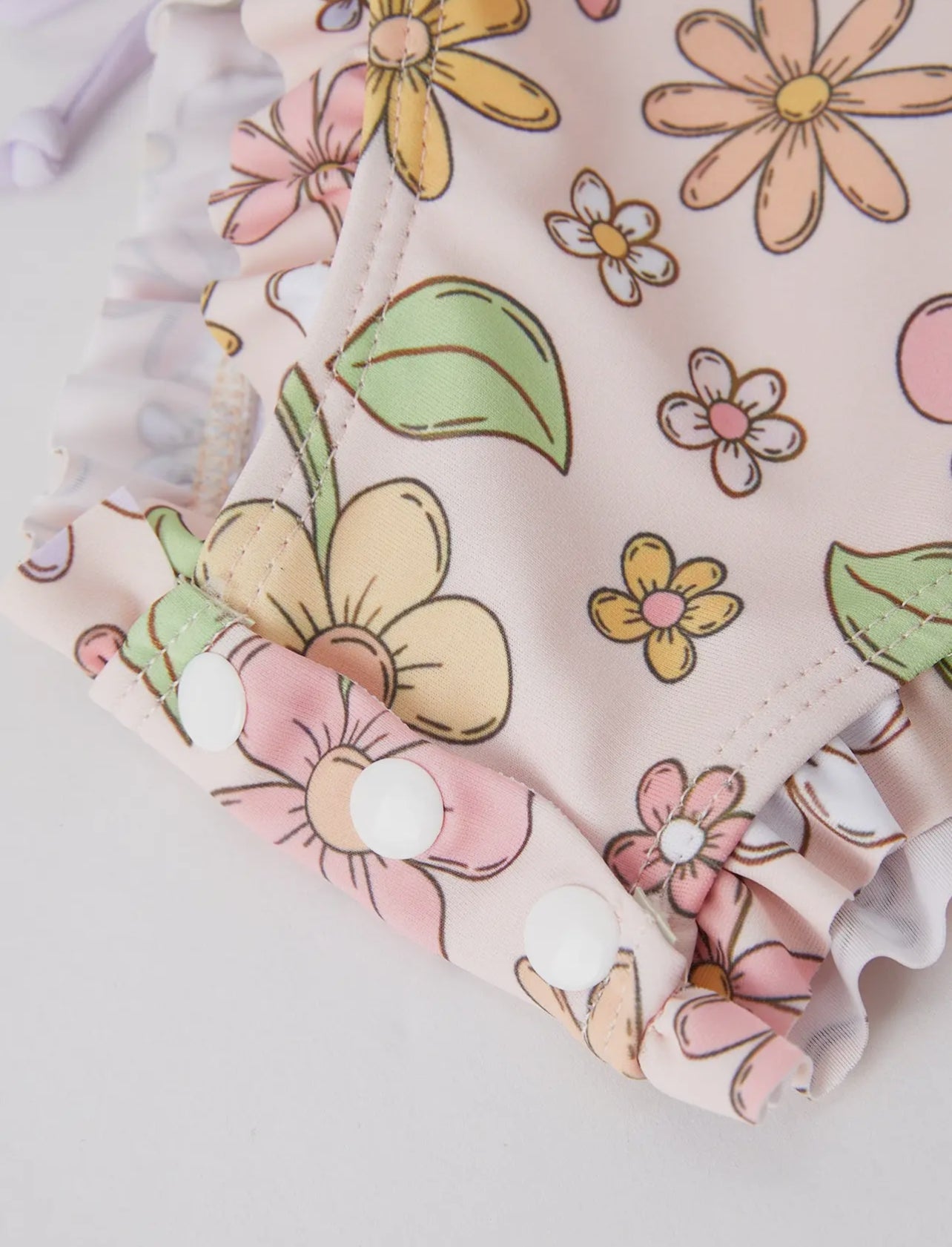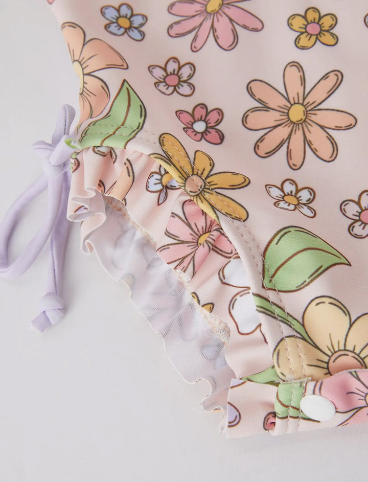 This one-piece swimsuit for babies/toddlers features cute ruffles and ties on the sides, adding both style and functional appeal. With buttons along the bottom, it's also easy to change your little one in and out of the suit, leaving more time for fun in the sun.