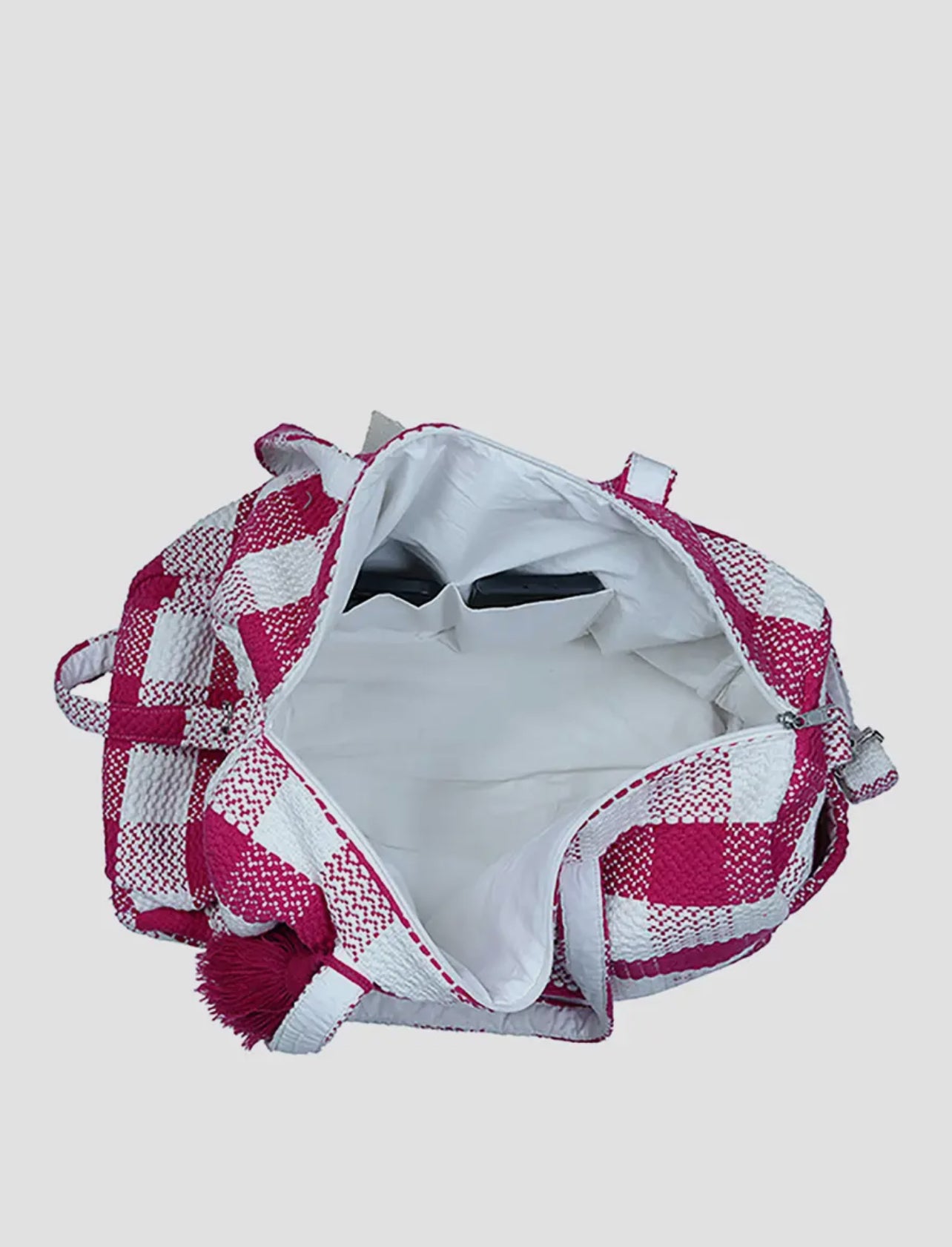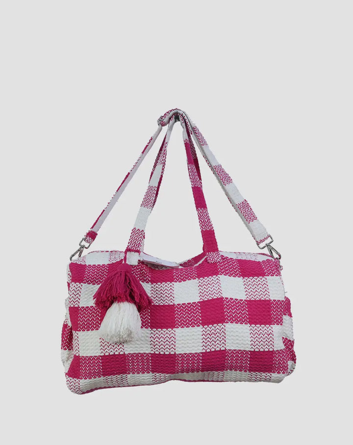 This Pink Checkered Weekender Tote is your perfect travel companion! With its adorable design and spacious interior, it can easily fit in a whole weekend's worth of clothes. The cotton weave adds a cute touch while the lined inside and 2 pockets keep you organized. Plus, you can wear it comfortably with either the shoulder or cross body straps. Travel in style with this versatile tote!