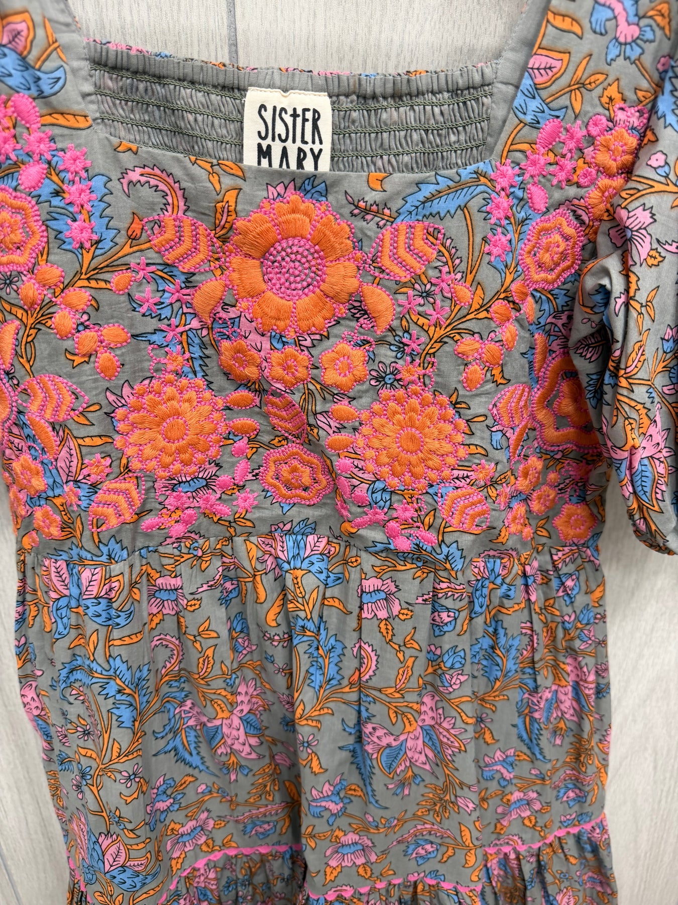 Vibrant, bold, and beautifully bohemian — The Arianna Dress is an absolute showstopper. This square-neck midi features striking floral embroidery in vivid shades of hot pink and tangerine that burst against a slate blue backdrop with a detailed paisley-meets-botanical print.