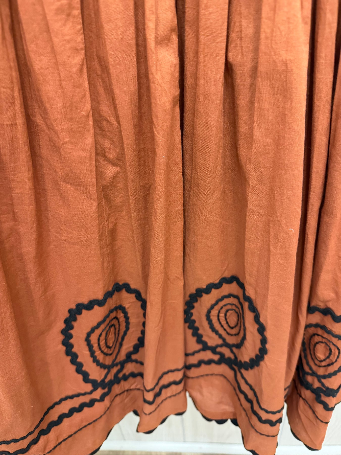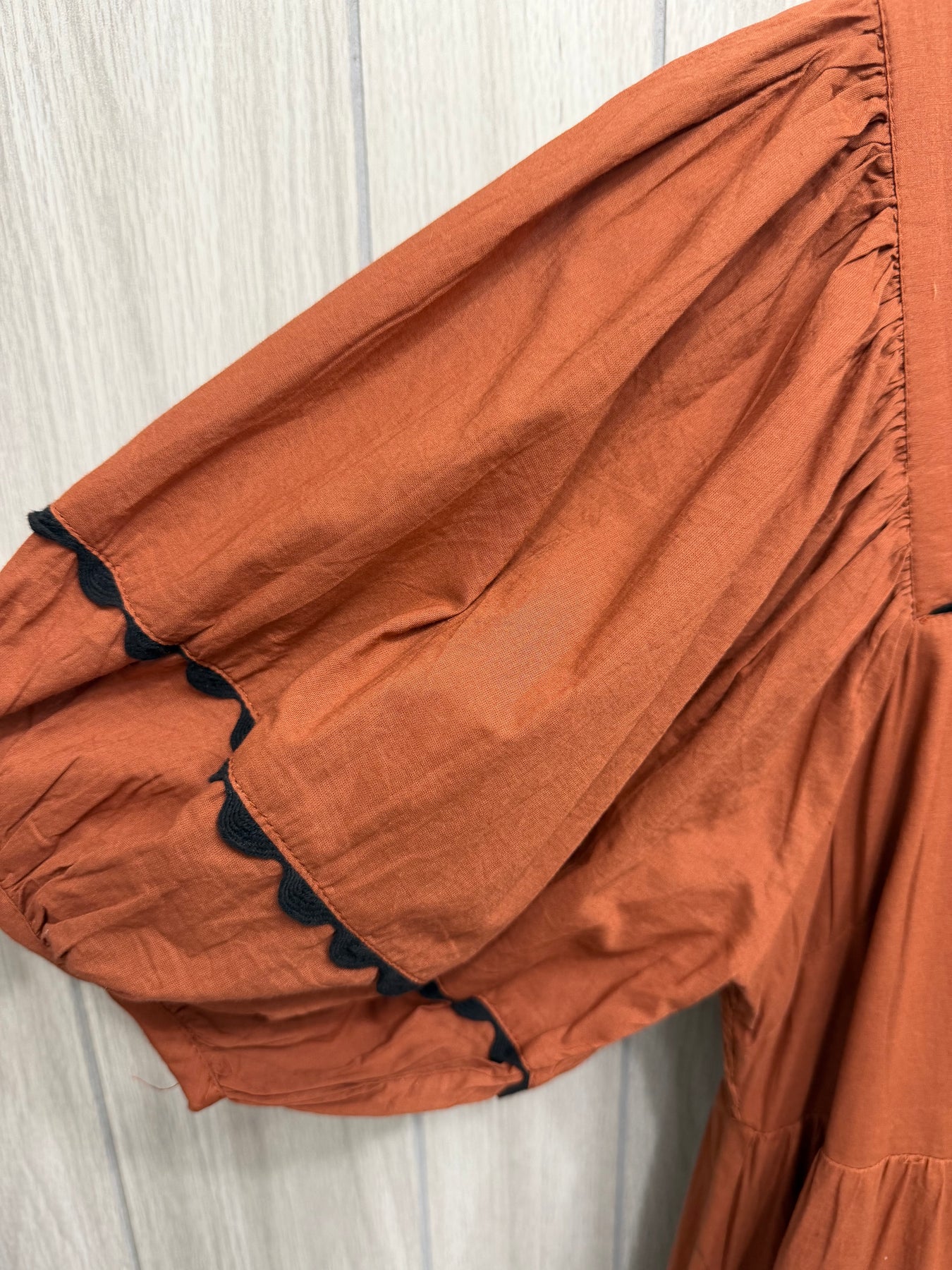 Charming with a touch of drama, The Loopy Midi Dress is fall’s answer to effortless boho chic. Crafted in a rich clay rust hue, this tiered midi dress features exaggerated puff sleeves with scalloped black trim and eye-catching black embroidery at the hem for a hint of whimsical detail.